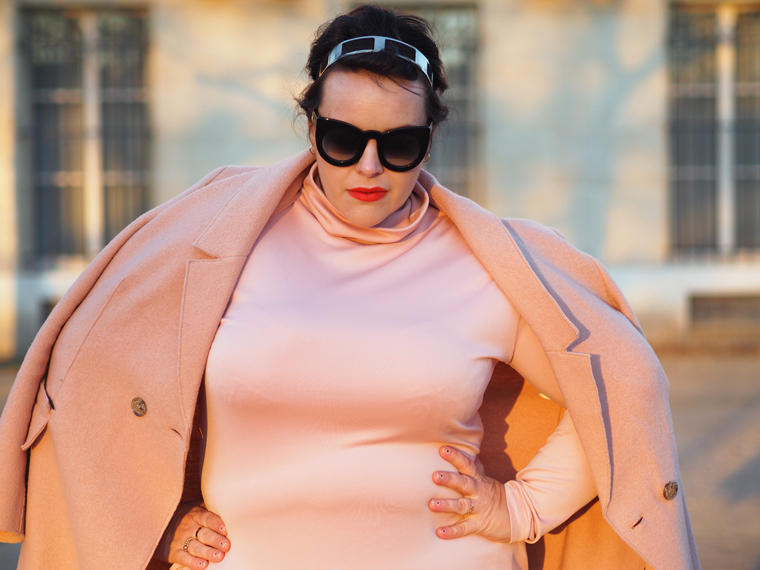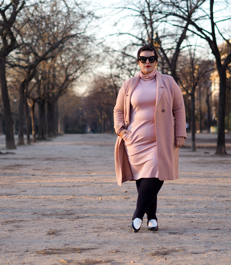 J’aime le rose poudre, j’en porte, et contrairement à ce que j’ai lu, ce n’est pas du tout interdit aux blondes, sinon, pourquoi j’ai des compliments quand j’en porte? Je n’aurais pas pensé associer un manteau de la même couleur. J’aime beaucoup la coupe de la robe et surtout son col, ca met le visage en valeur.