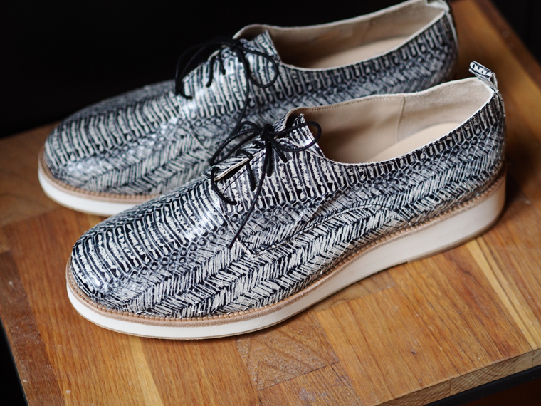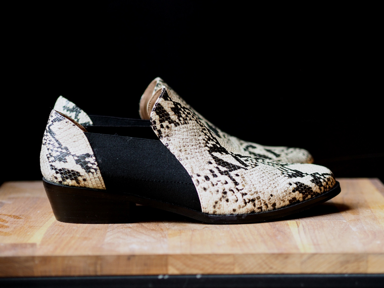 Hasard total, j’ai acheté 3 paires cette semaine qui ont un point commun: leur cuir façon peau de serpent. Chacune à sa manière, le cuir est travaillé comme du reptile.