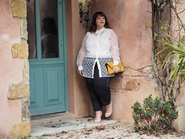 J’aime tout ! Le chemisier me rend dingue d’envie mais le prix est prohibitif pour moi ! Le pantalon est super, dommage que tu aies arrêté ta collaboration avec taillissime. Et évidemment cette pochette moutarde, chic et moderne à la fois; bref, j’adore!