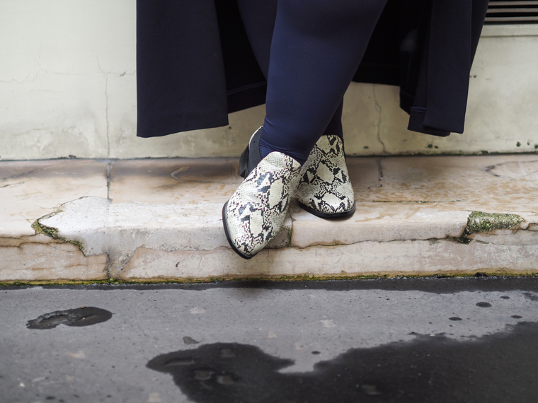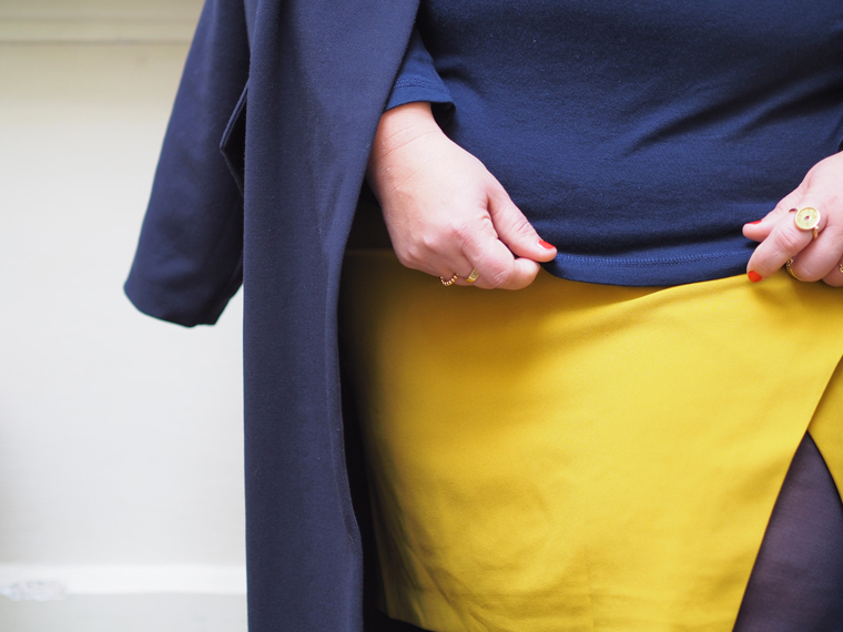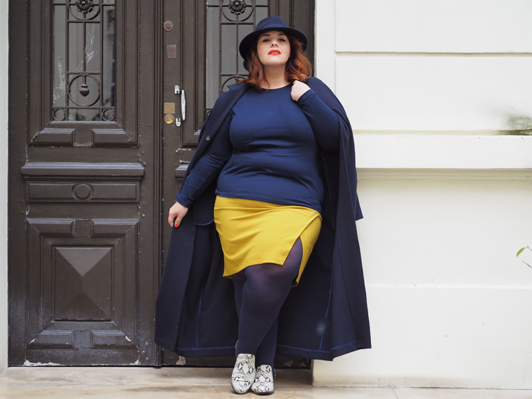 Ca flashe ;) Le bleu marine avec ton roux, c’est juste une tuerie. Le jaune moutarde réveille tout ça en plus ! Je suis moins fan avec l’association des chaussures, j’aurais bien vu tes sneakers blanches effet reptile avec :)