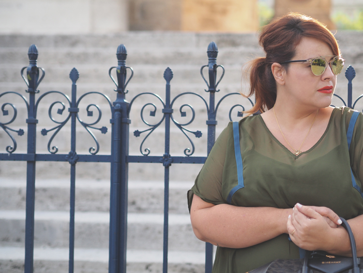 ce bleu qui rehausse le kaki j’adore! et ca va si bien avec ta couleur de cheveux! (au passage j’aime beaucoup cette queue de cheval un peu floue)