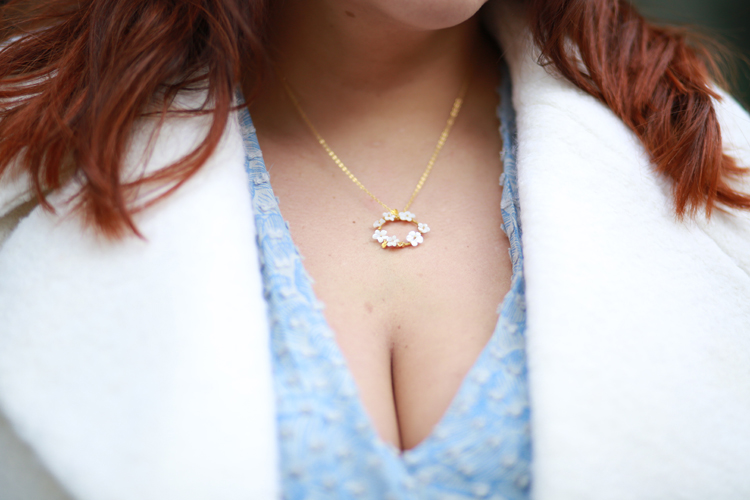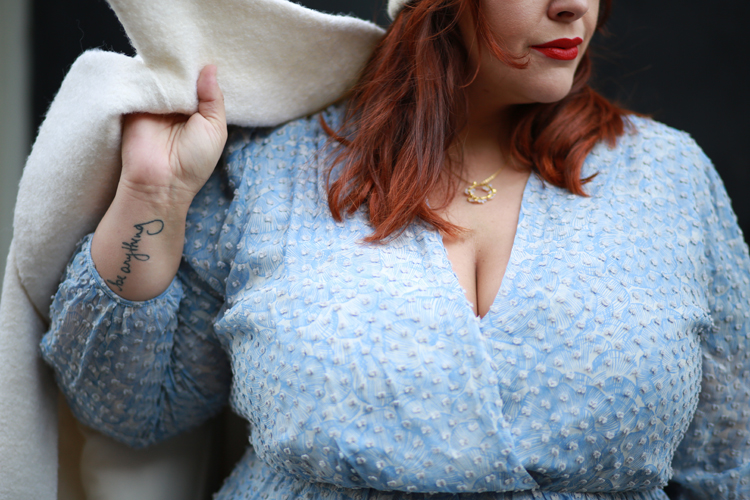 Manteau oversize Asos Curve + Robe en soie Boden + Collier Corpus Christi