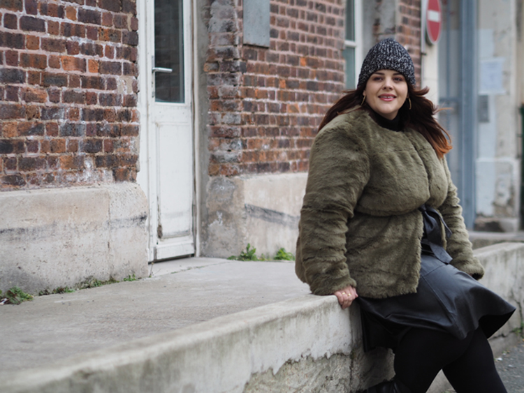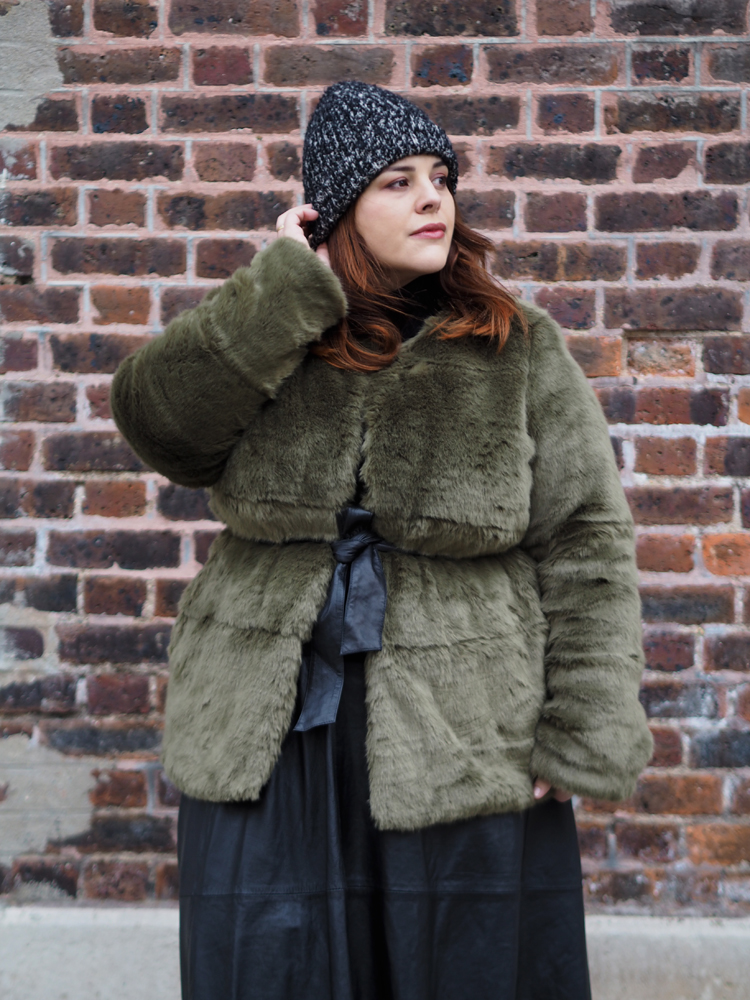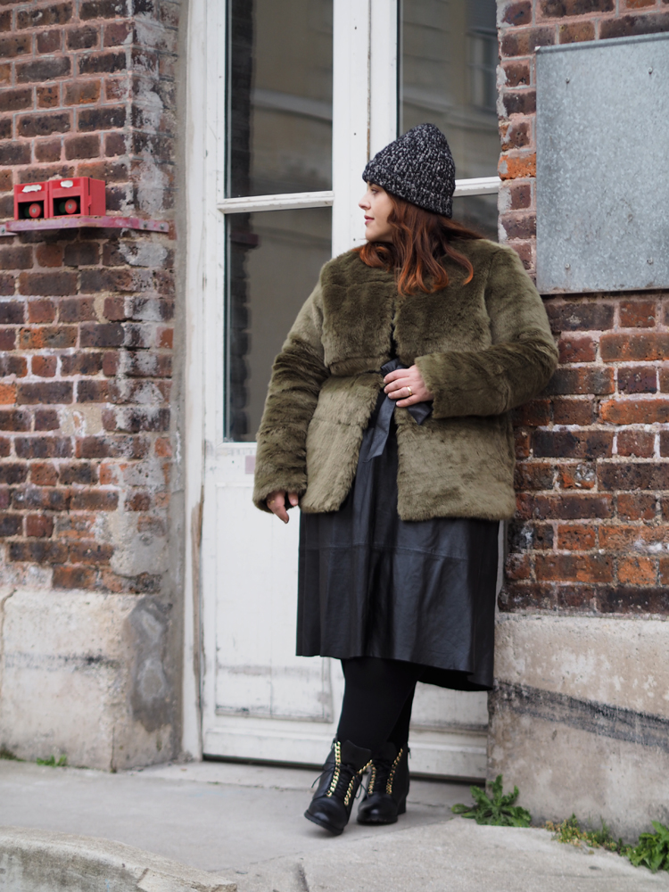 Manteau fausse fourrure Taillissime + Pull col roulé Boden + Jupe en cuir Asos (old)