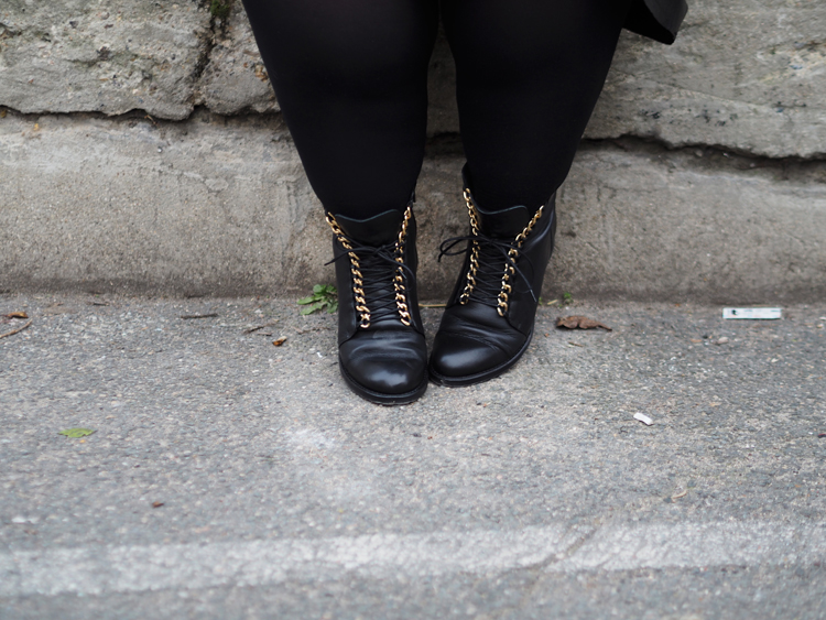 At my feet a second pair of boots, my addiction of the moment. I particularly like the little golden chain that serves for passing the laces.