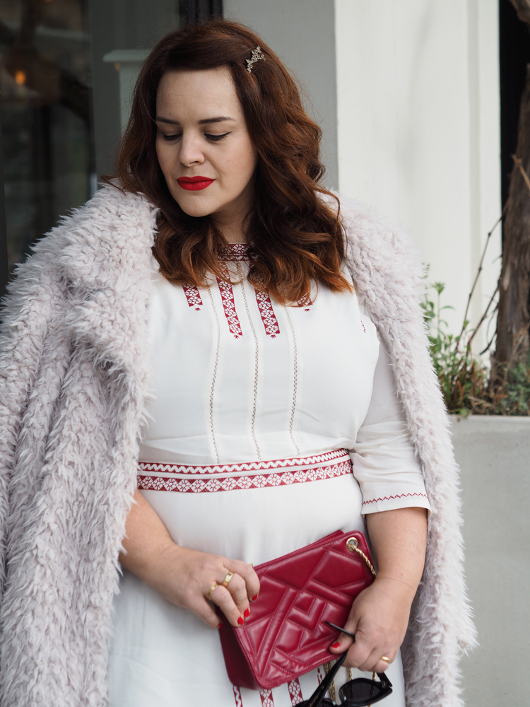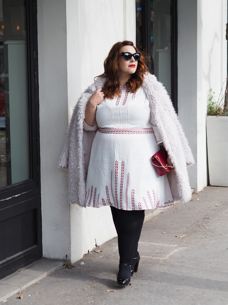 White dresses or creams that you see me much wear with opaque tights in winter. And this embroidery key “slave” on the dress, cross stitch. I just love it!