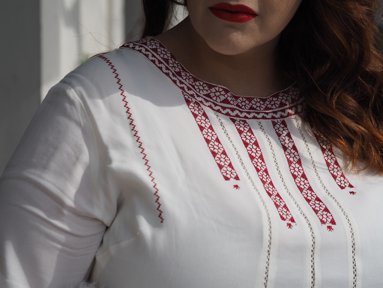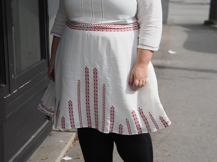 Très jolie robe, les broderies sont fines, j’ai déjà recherché des tops dans ce style et souvent les broderies forment un “placard” pas très heureux. Je me laisserai presque tenter. Sur leur site, la robe n’est pas mise en valeur, a cause du fond blanc, pourtant leur mannequin la porte bien aussi. J’aime bien tes photos de détails, j’y suis très sensible.