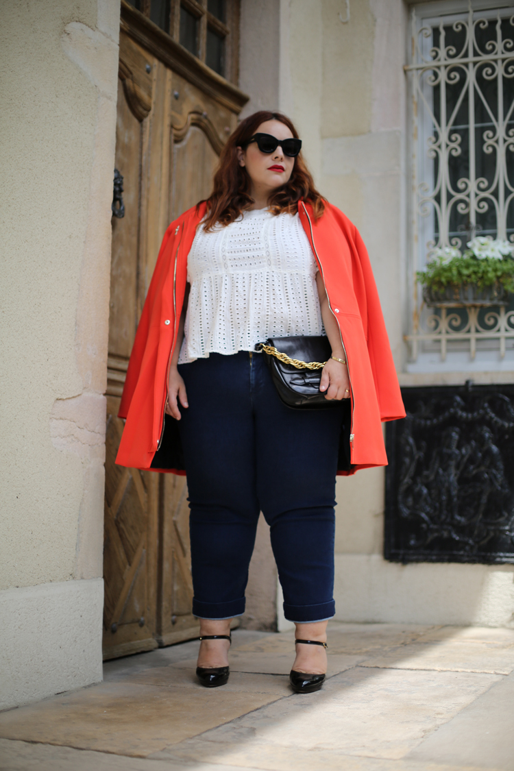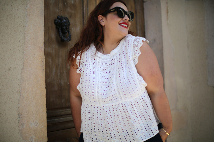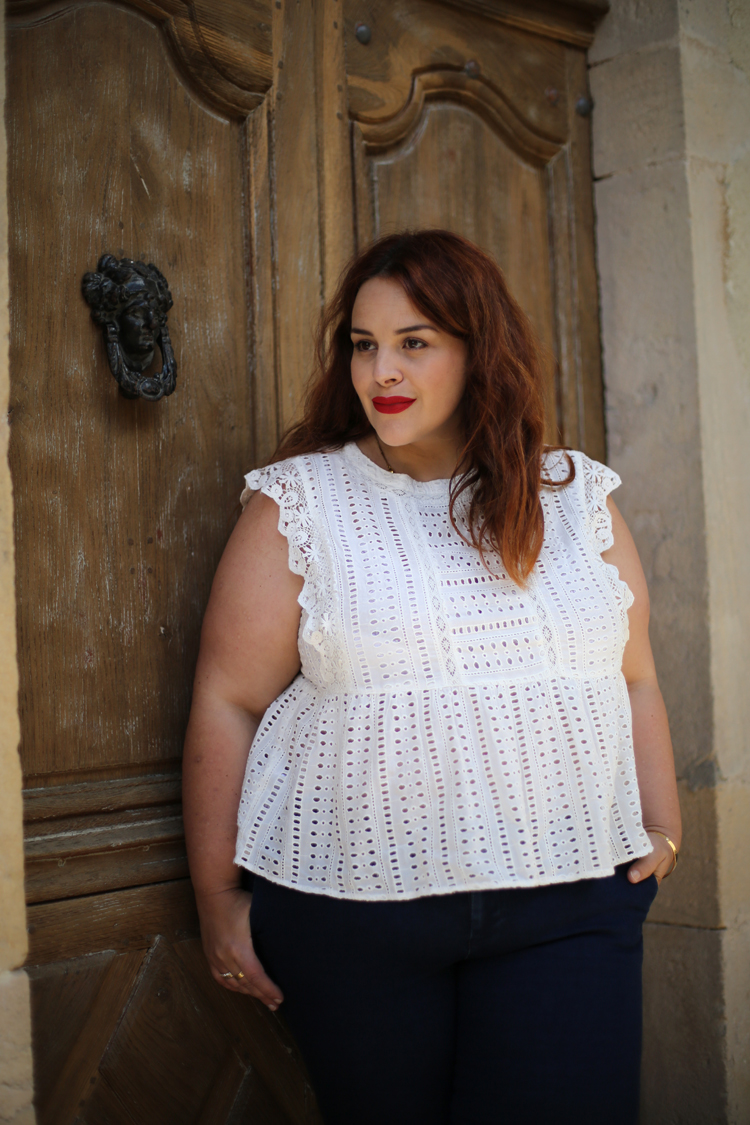 Par contre, j’ai une petite question, j’ai acheté un jean slim blanc de chez Violeta by Mango, et il moule pas mal mes jambes, que pense-tu du slim blanc pour une ronde? Merci.