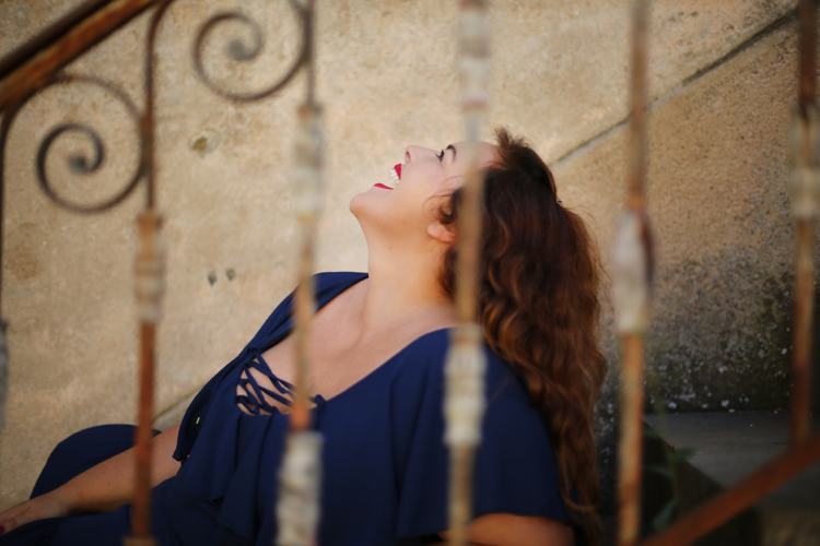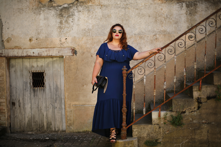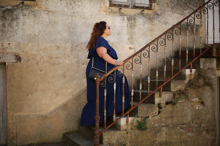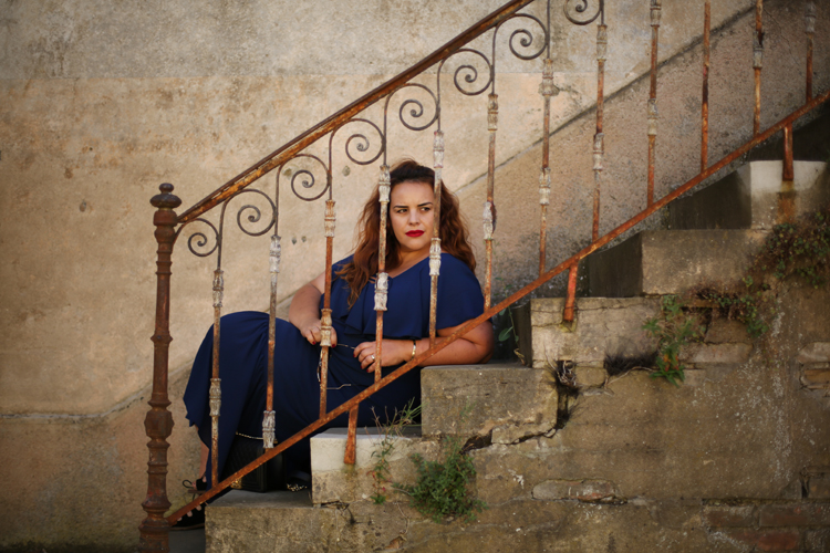 La robe est hyper jolie et j’aime bien l’ambiance des photos. Le bleu magnifique de la robe contraste avec l’escalier en pierre et la rampe en fer forgé, les tâches de rouille, les couleurs passées. C’est un village où on peut tout imaginer, qui nous appartient, où tout est serein. J’ai aussi tendance à imaginer l’intérieur des vieilles demeures délaissées : y-t-il un trésor, des secrets, de vieux objets ??? La porte s’ouvre-t-elle sur de la poussière et derrière tout au fond une autre porte s’ouvre peut être sur un jardin avec des herbes folles où on peut s’inventer mille aventures…..
