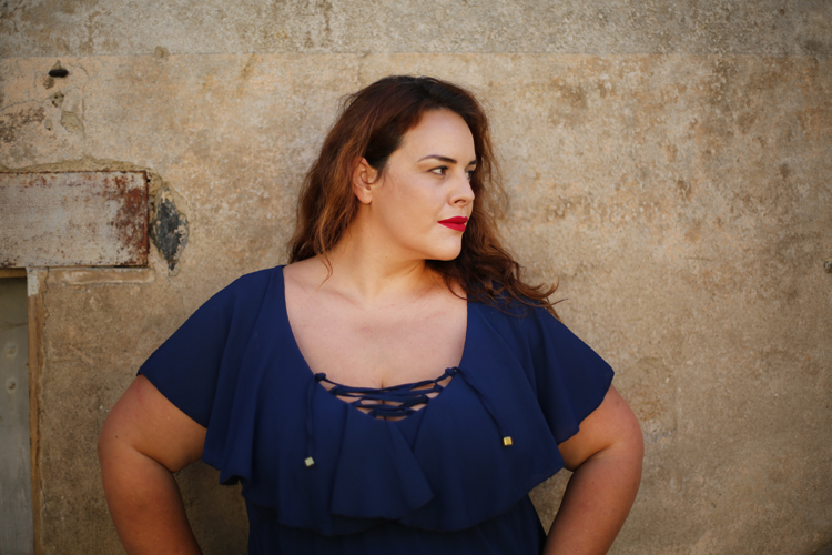 C’est assez décalé, le décor et la robe+accessoires. Le bleu marine va bien aux peaux hâlées, décidément. C’est une couleur à sortir de son côté b*ise-beige!