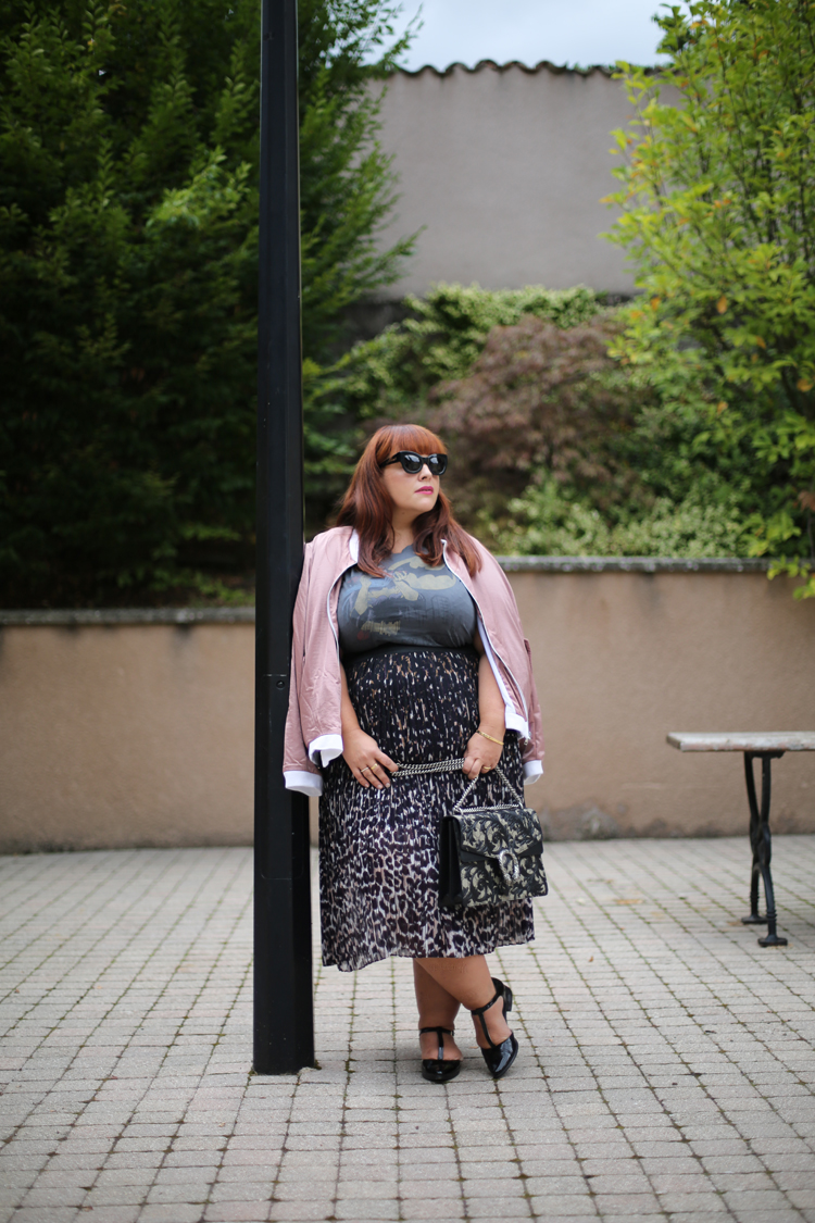 c’est marrant aujourd’hui je porte une jupe plissée ASOS bleu ciel et un tee noir mais pas de bomber, une veste en jean !! mais bon il me manque le sublime sac !