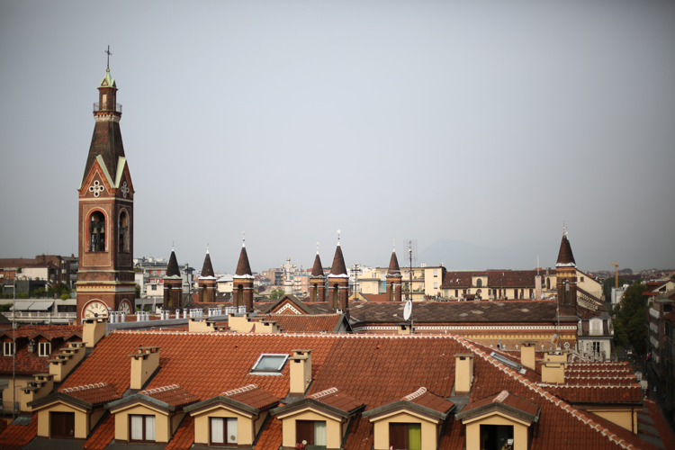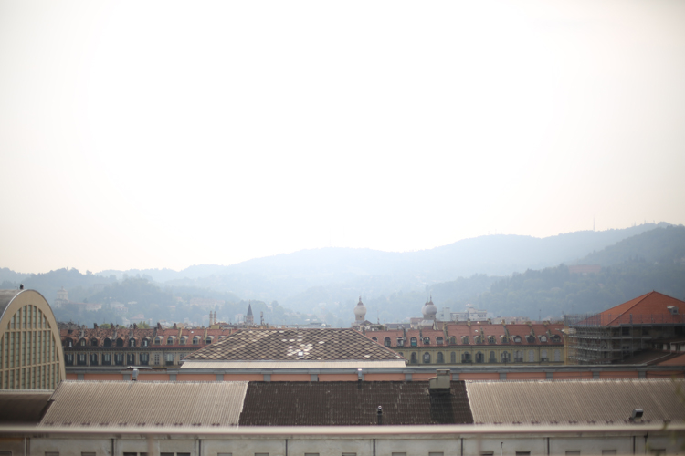 Il a fait très très chaud ce week-end, « l’afa » plombait la ville avec plus de 35°C. C’est d’ailleurs ce mélange de brouillard gris et de pollution que englobe la ville que l’on peut voir depuis ce magnifique rooftop du Turin Palace Hotel qui contrairement à son nom n’est pas un palace mais un hôtel 4 étoiles. Il est hyper bien placé, fraîchement rénové, j’ai vraiment beaucoup aimé cet hôtel. Les chambres sont spacieuses et calmes (ce qui est rares en Italie), et le petit déjeuner est vraiment dingue.