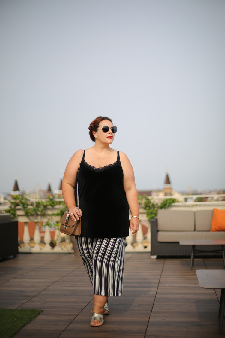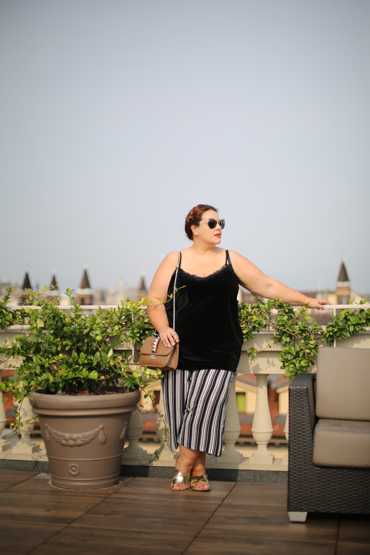 Je portais un de mes combo favori, une jupe-culotte et un top à bretelles en velours. Nous allons retrouver beaucoup de pantalons de ce type cet hiver et ça tombe bien car j’adore ce style.
