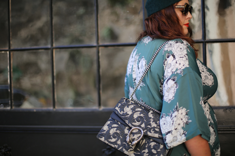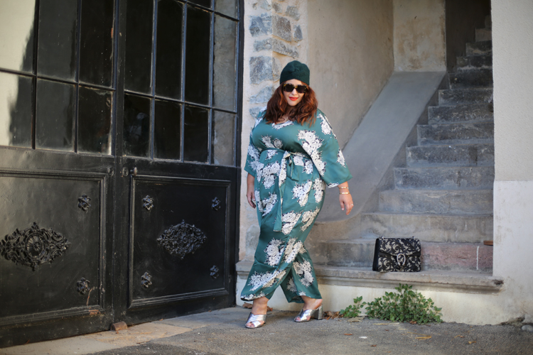 Combi kimono Asos Curve – Turban Sézane – Mules New Look – Bag “Arabesque” Gucci – Sunglasses Karen Walker