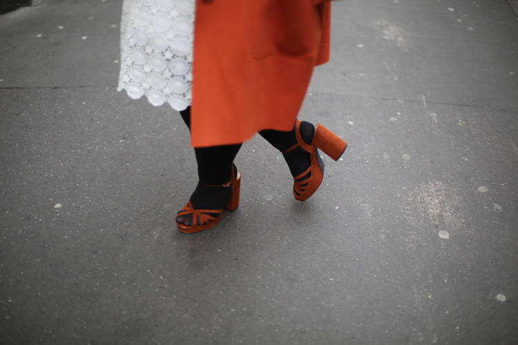 J’adore ce genre de look! La robe délicate et le manteau plein de peps, ça apporte de la joie dans la grisaille automnale. Un conseil de chaussures plates à porter avec cette association?