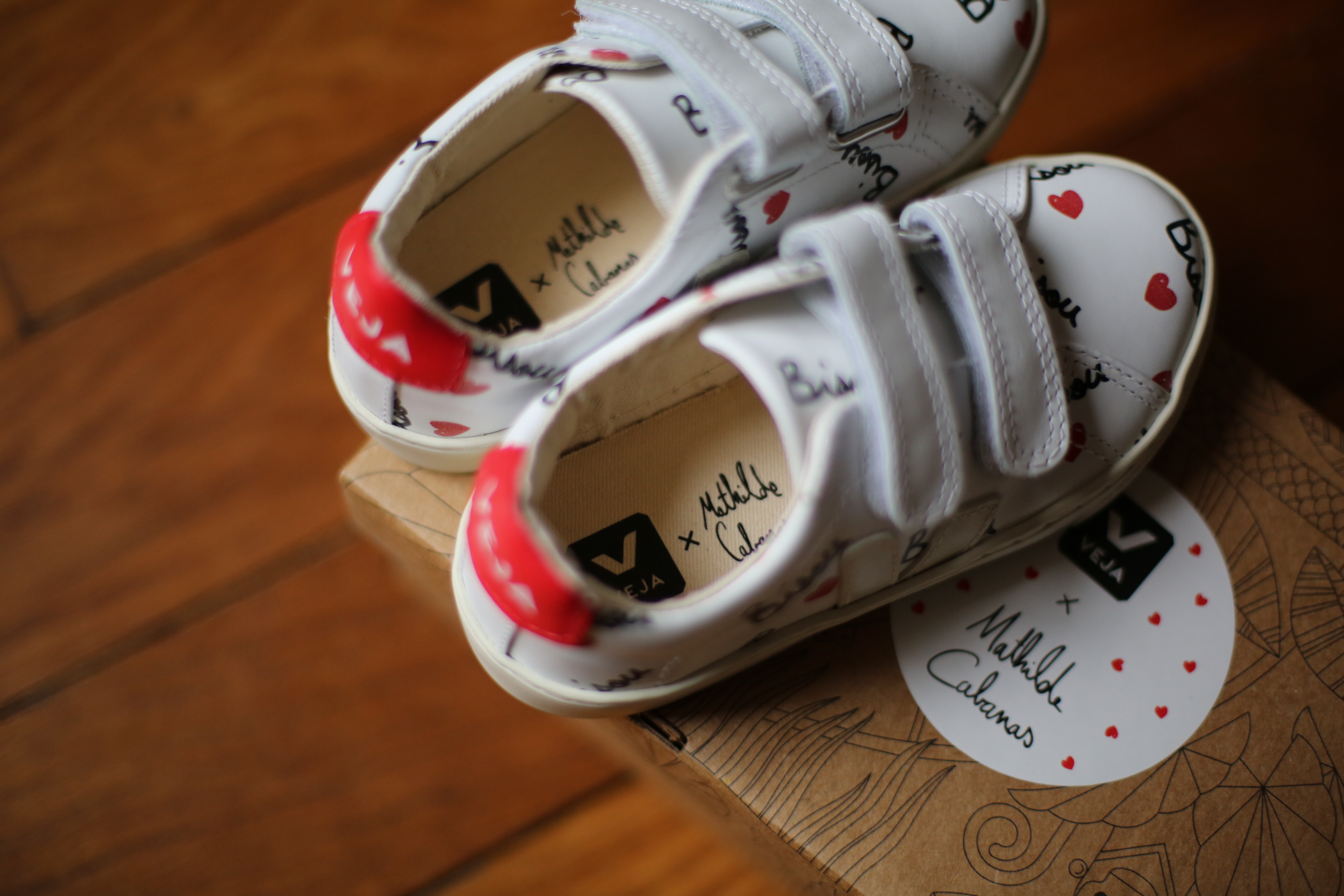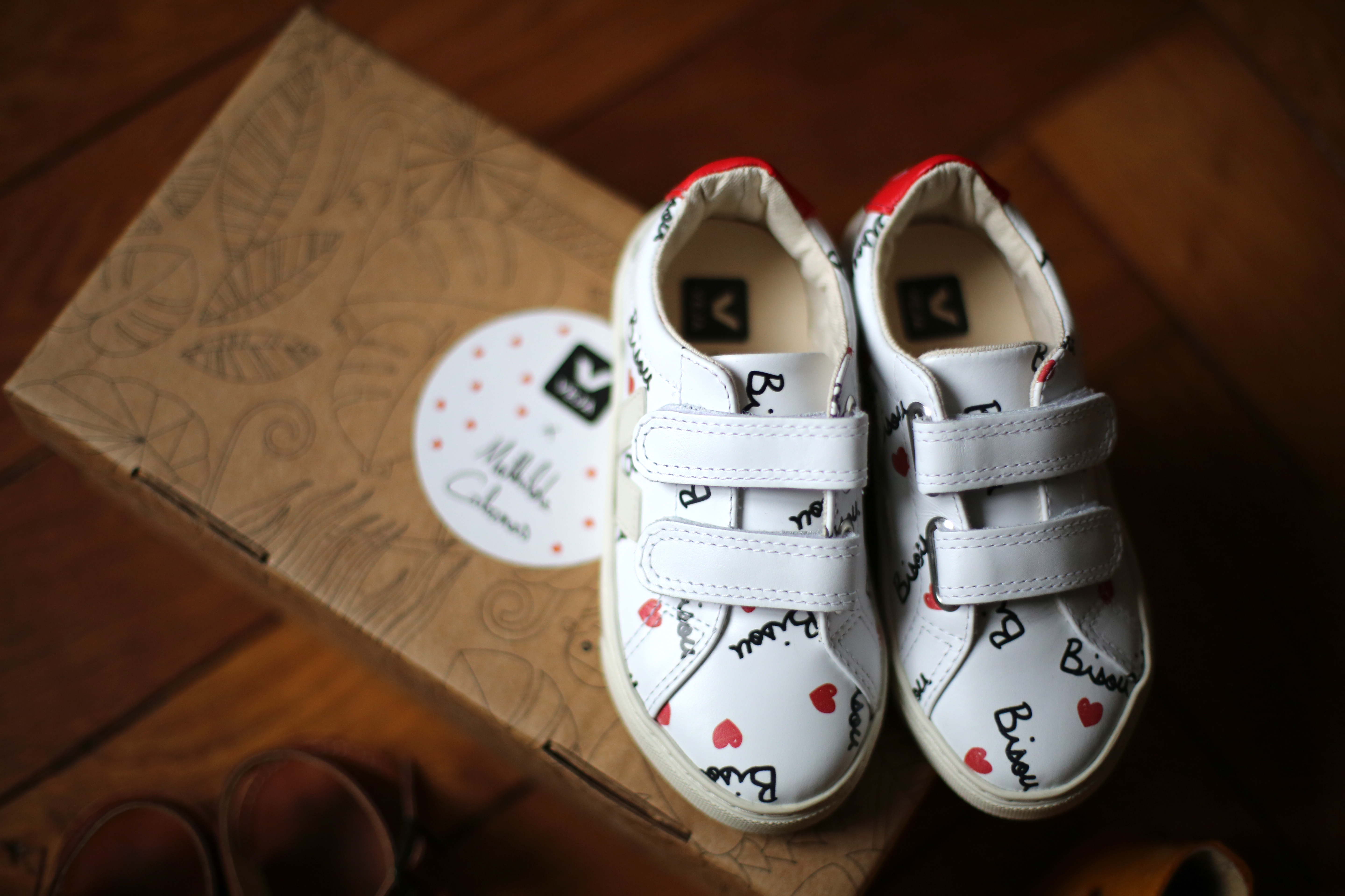 Puis une paire de sneakers, c’est un incontournable dans le dressing d’un petit garçon, et comment ne pas craquer pour ces « BISOU » tout partout avec les dessins de Mathilde Cabanas pour Veja? Vraiment adorables!