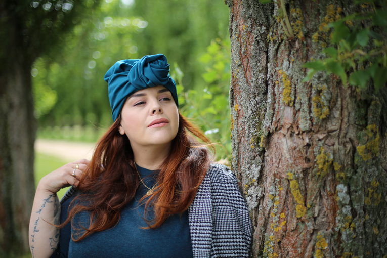 Turban magnifique, très belle couleur, ca va à ravir avec la couleur de tes cheveux. Et ce maquillage nude est parfait.