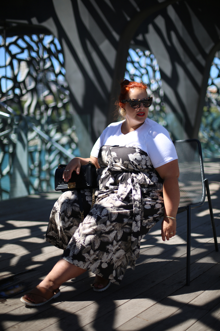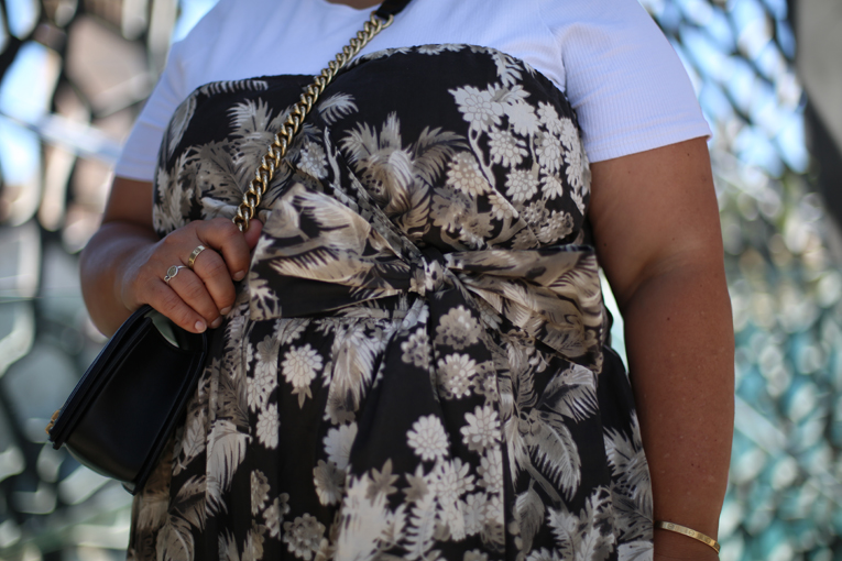 L’imprimé de ce jumpsuit est vraiment beau, et j’aime particulièrement le grand noeud sur le côté qui permet de bien marquer la taille. Si cette pièce vous tente, elle taille plutôt grand donc si vous hésitez entre deux tailles, prenez la plus petite.