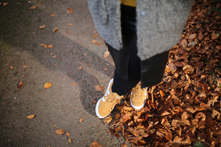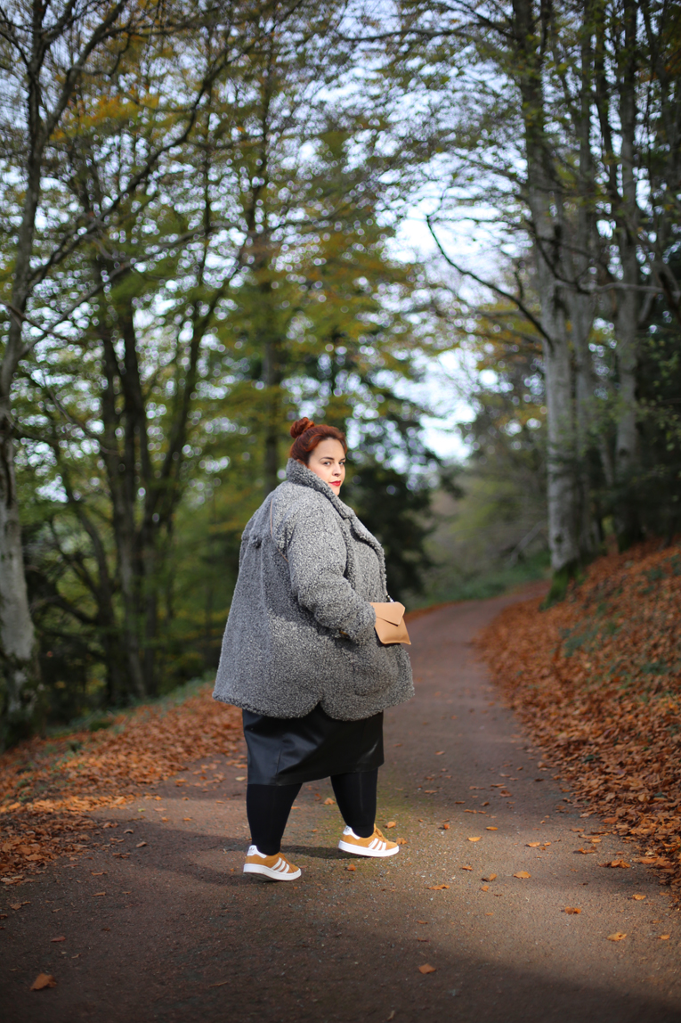 Manteau Monki (dispo en crème ici) – Pull Forever21 – Jupe h&m+ – B.o Poupée Rousse – Sneakers Campus Adidas