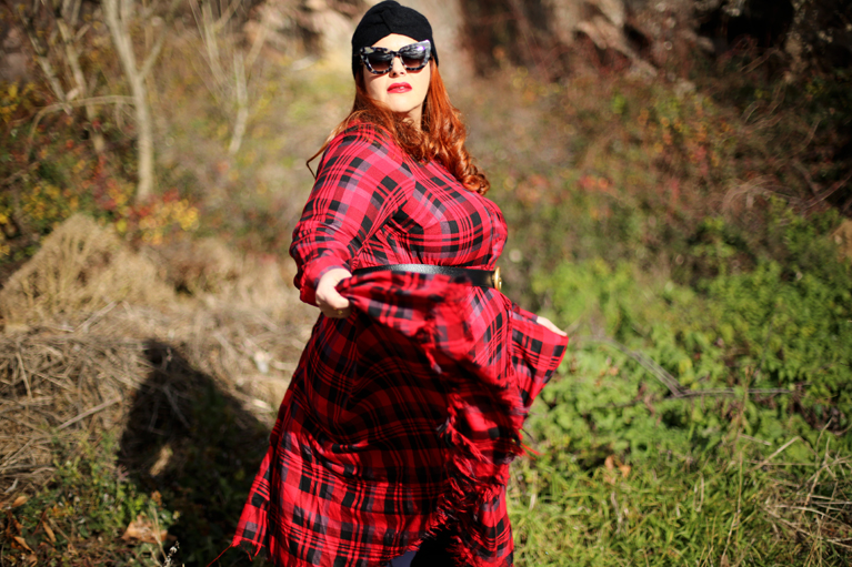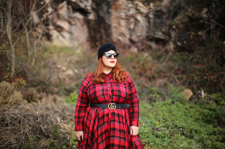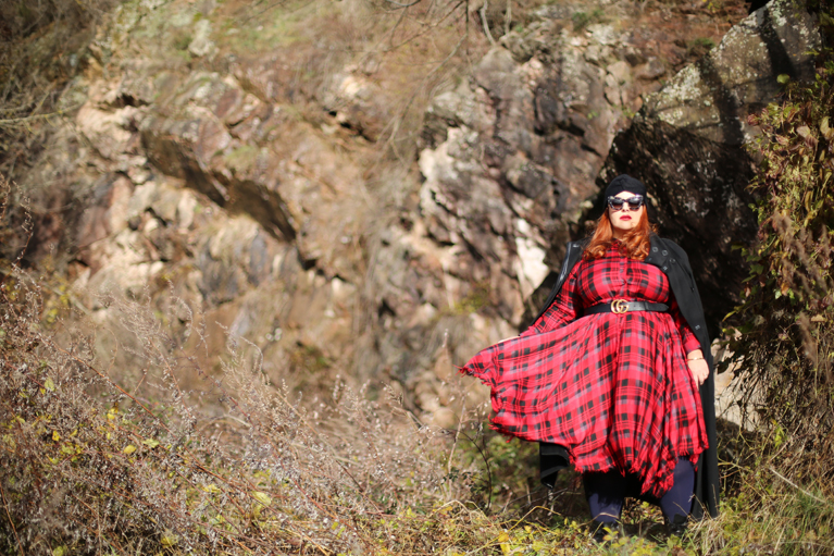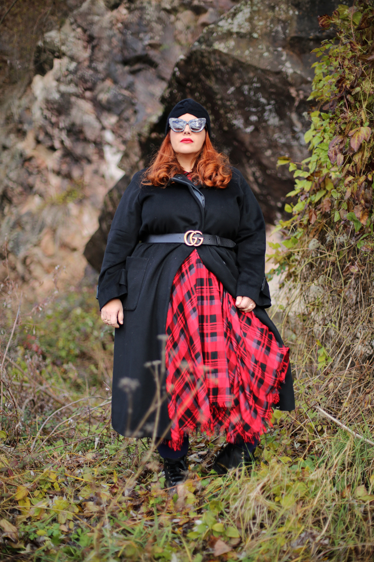 Robe à carreaux Yoursclothing – Manteau Marina Rinaldi – Ceinture Gucci – Bottines Sézane – Bonnet Sézane