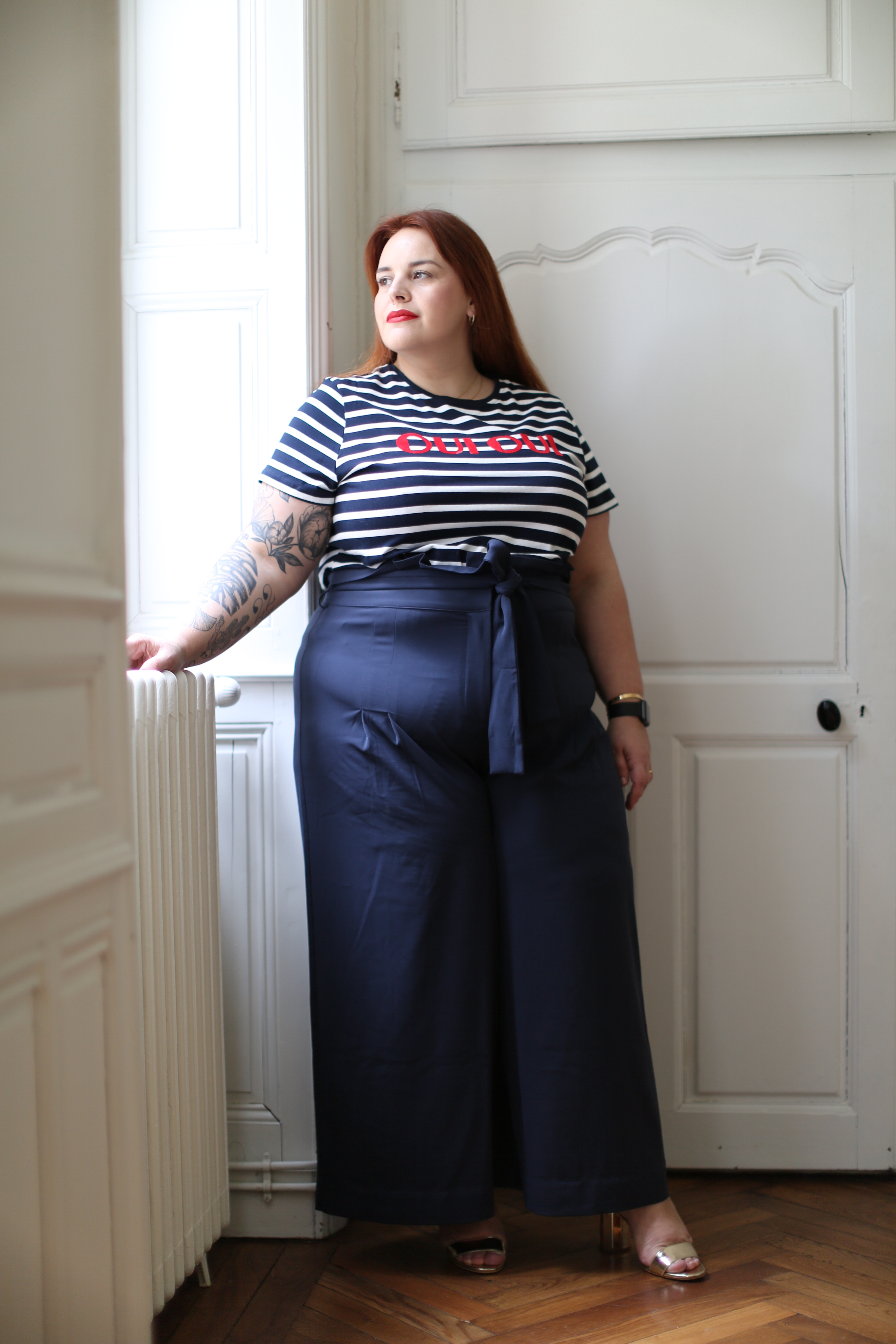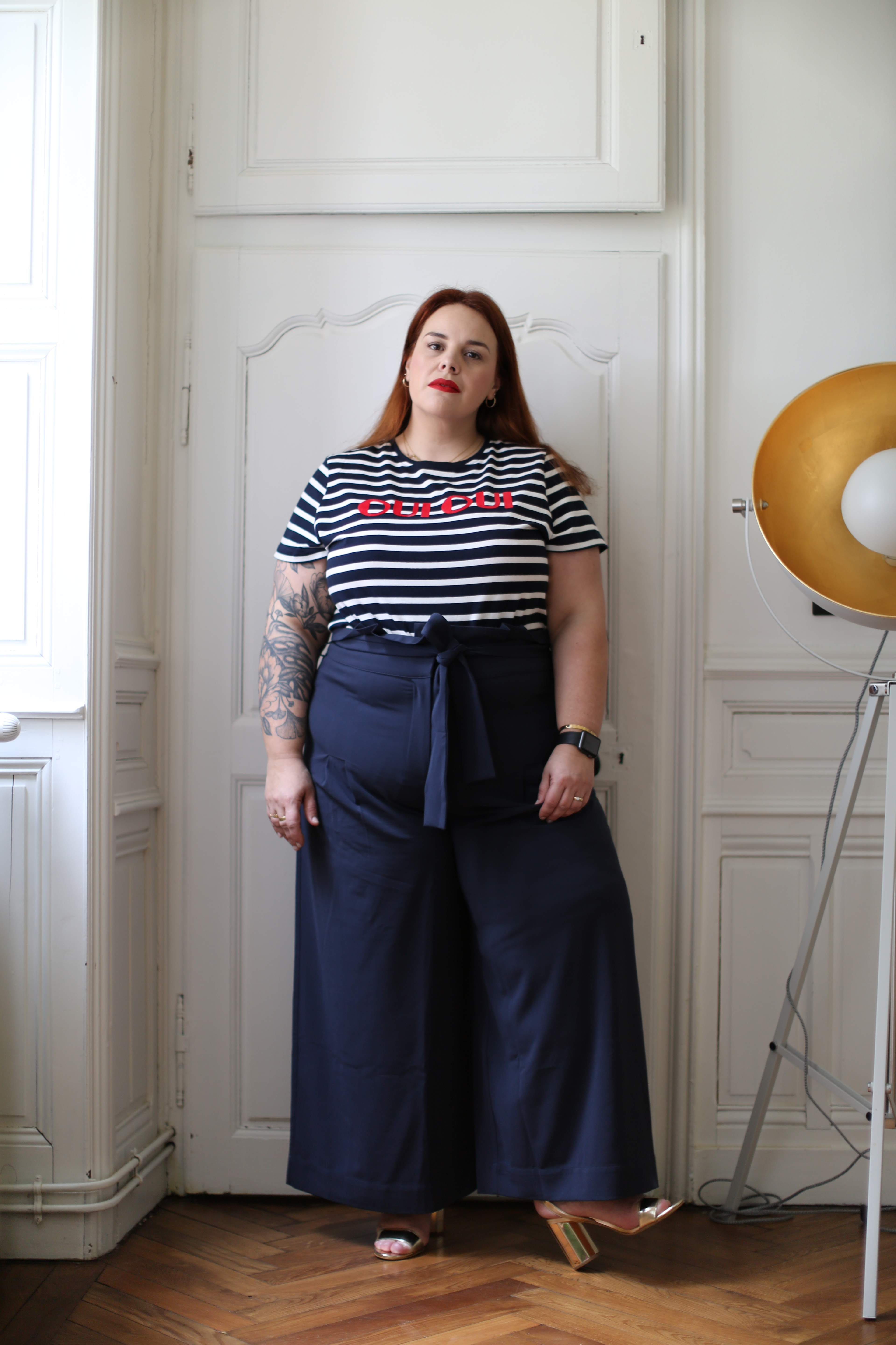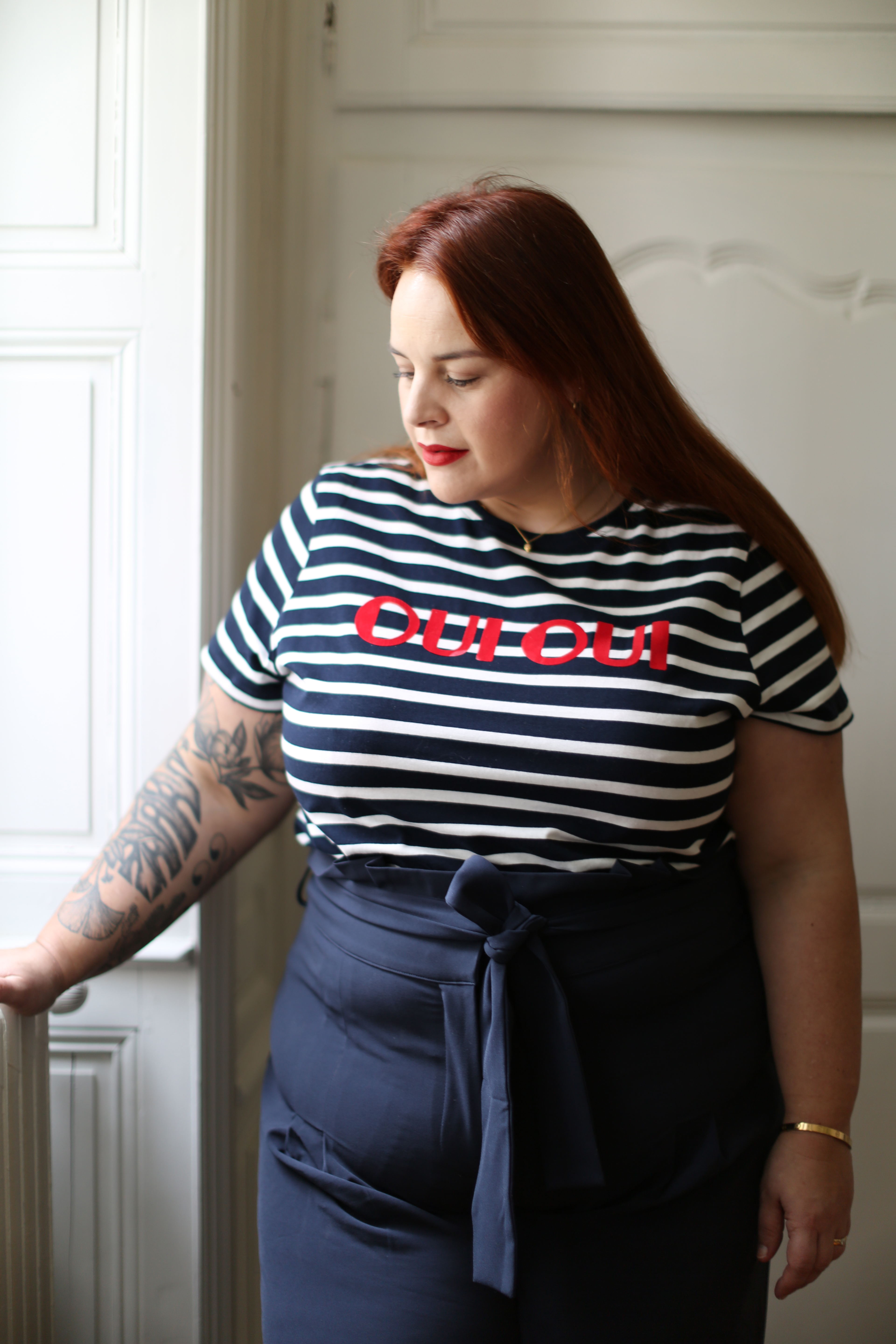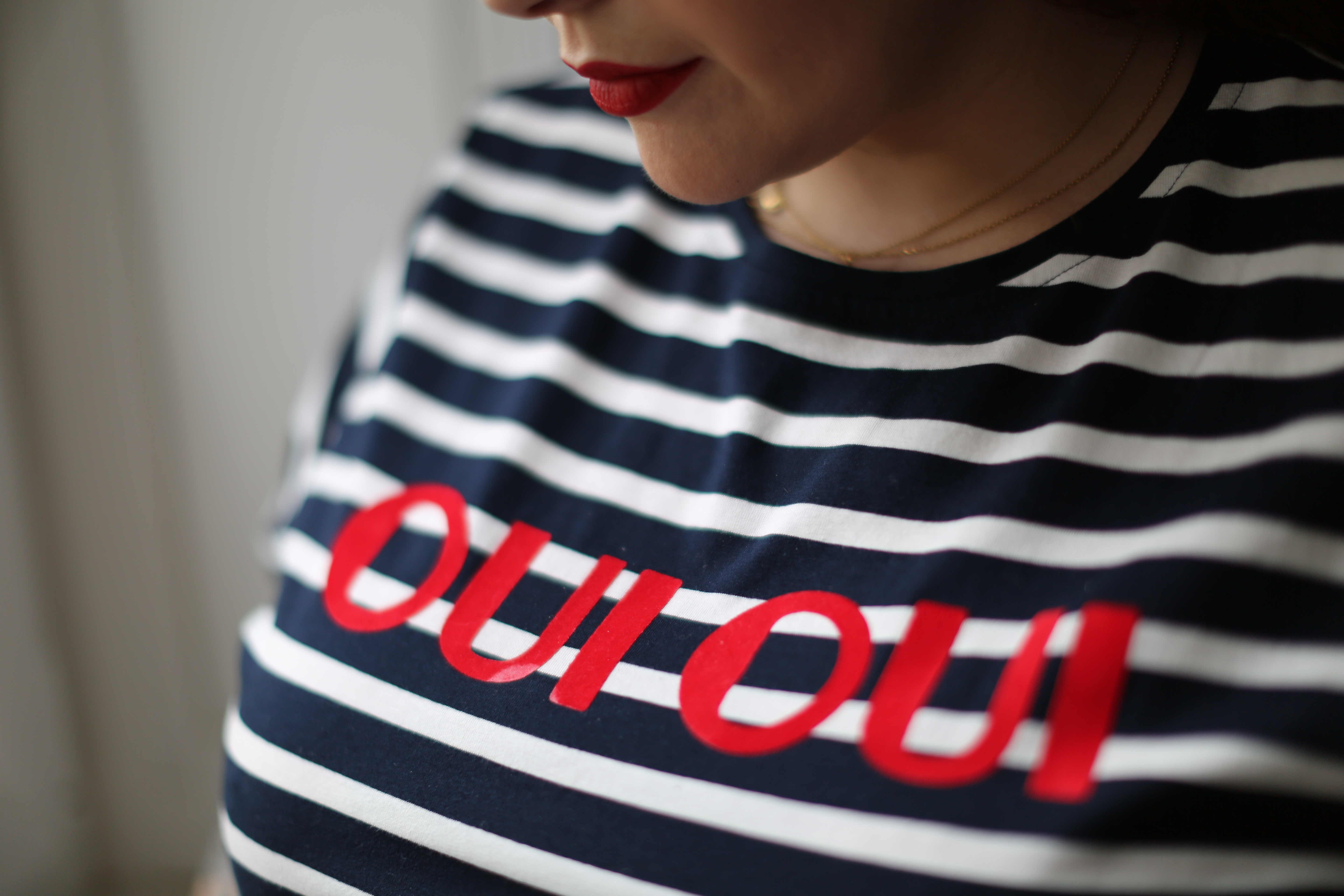 Pour jouer l’esprit marin d’eau douce, je lui ai associé ce t-shirt flanqué de deux grands OUI comme un cri, 2x OUI pour une mode sans limite!