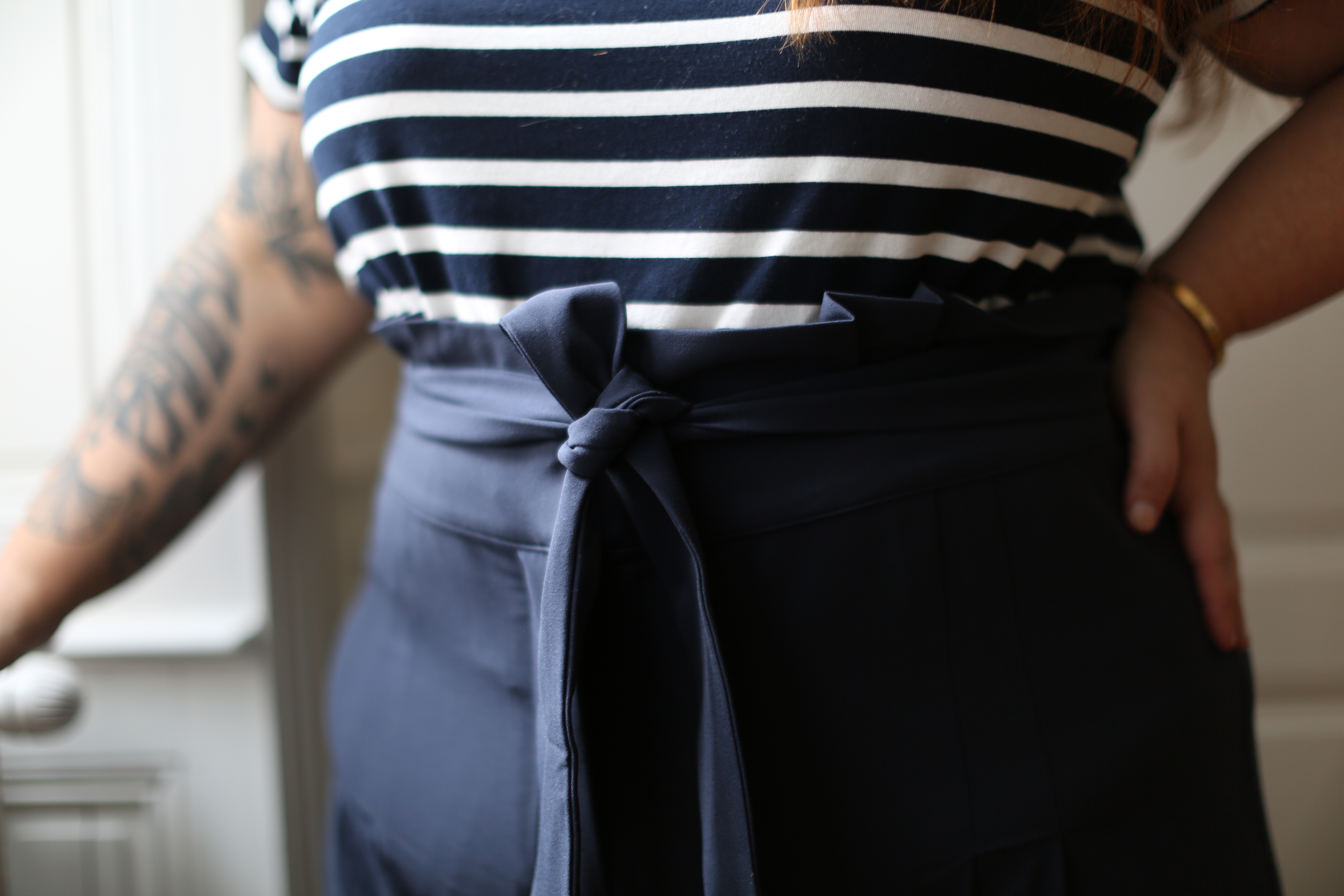 La première tenue que j’ai choisi c’est ce superbe pantalon taille haute avec la ceinture nouée, il est vraiment magnifique. Le tissu est souple au tombé parfait, il monte vraiment bien haut sur le ventre et les petites fronces juste en dessous de la poitrine sont ultra féminines.