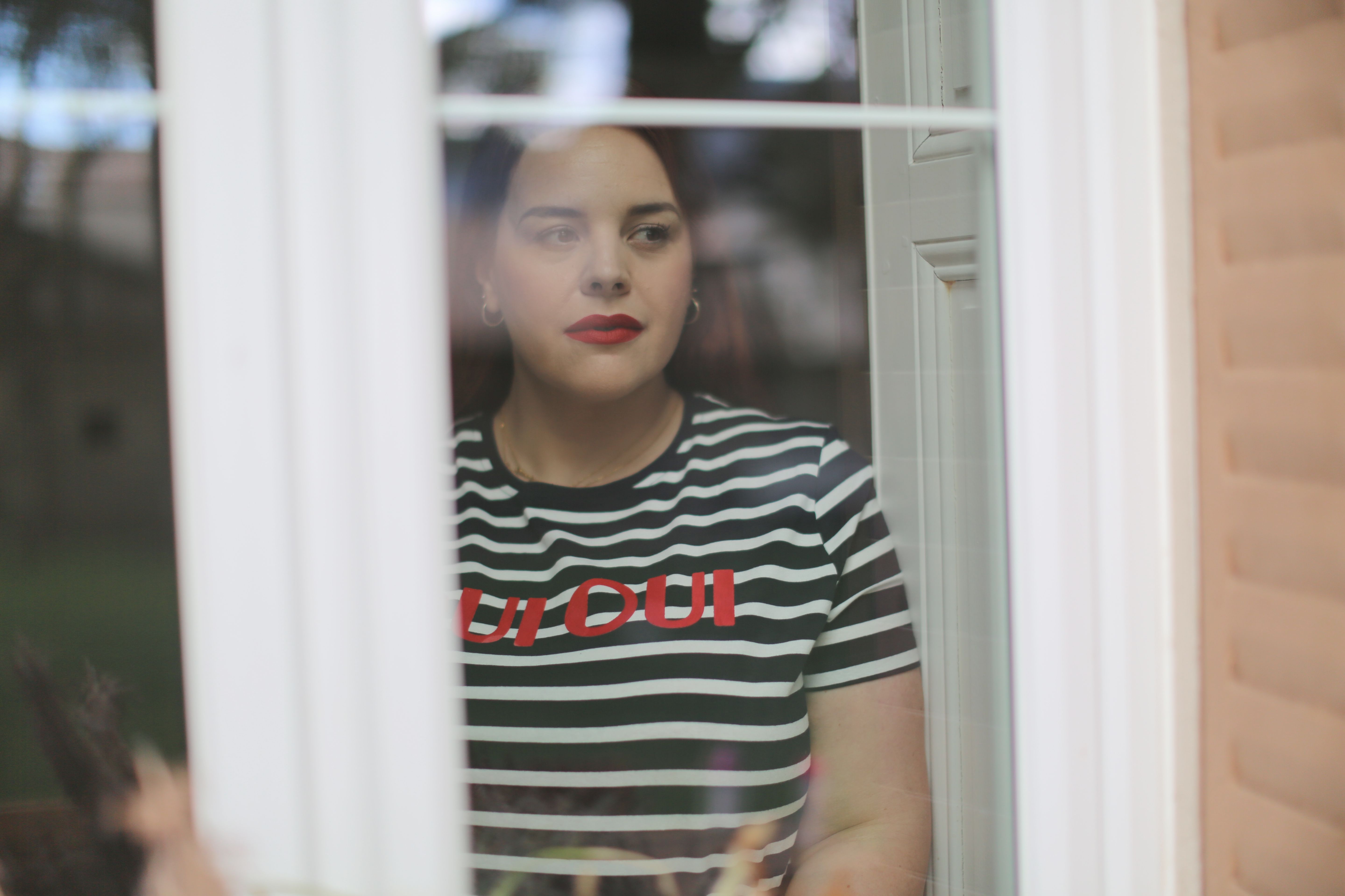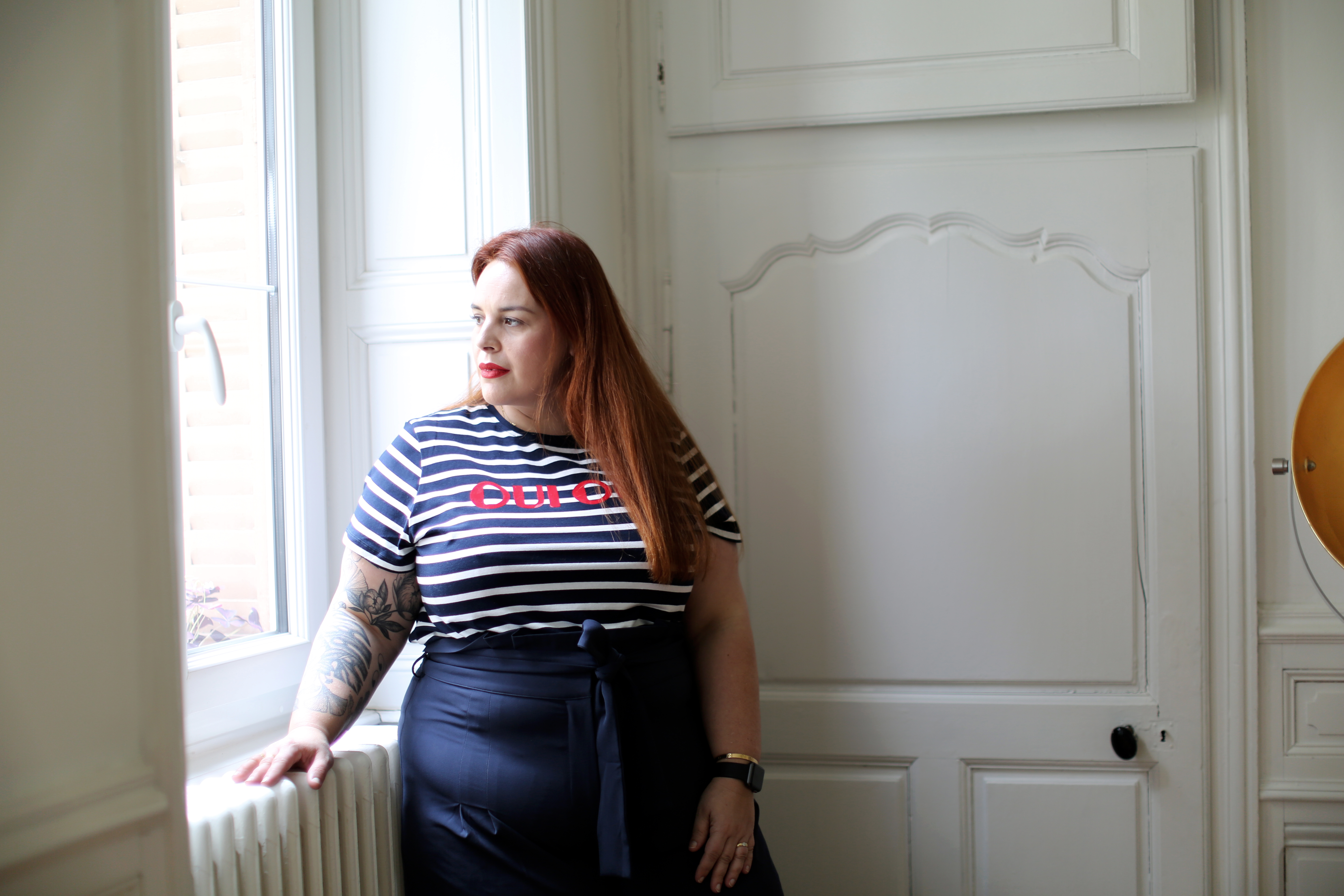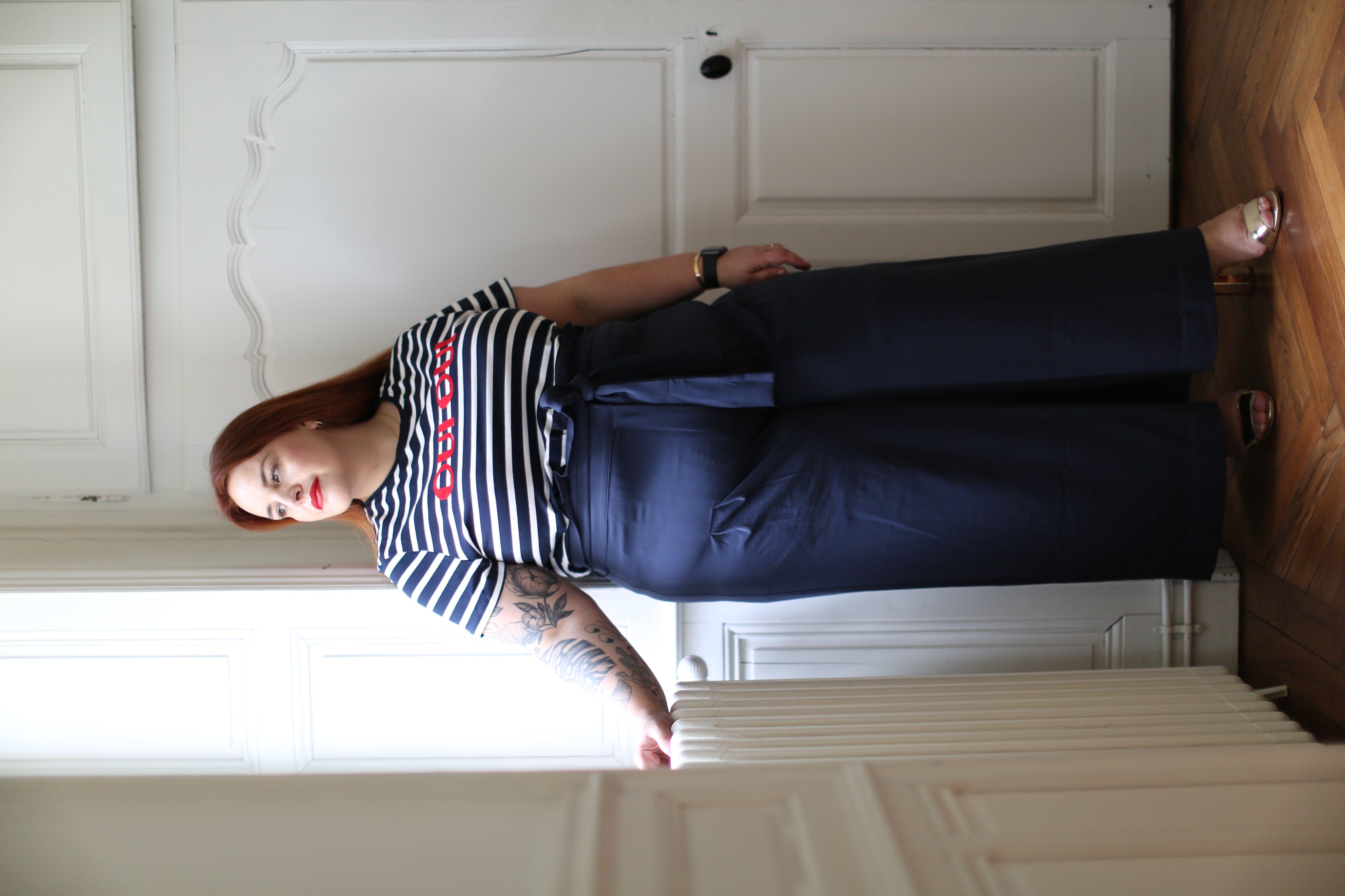 Pour jouer l’esprit marin d’eau douce, je lui ai associé ce t-shirt flanqué de deux grands OUI comme un cri, 2x OUI pour une mode sans limite!