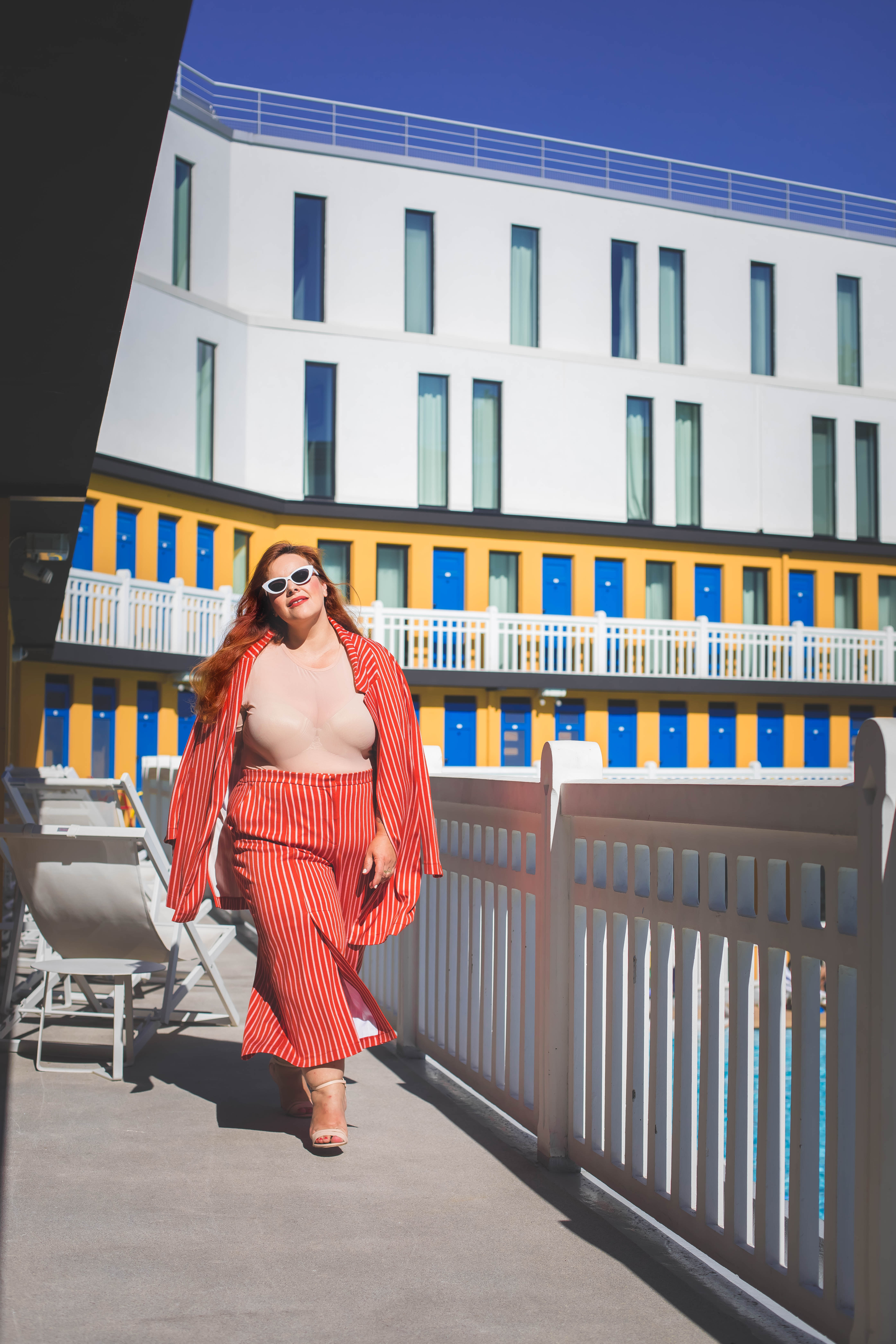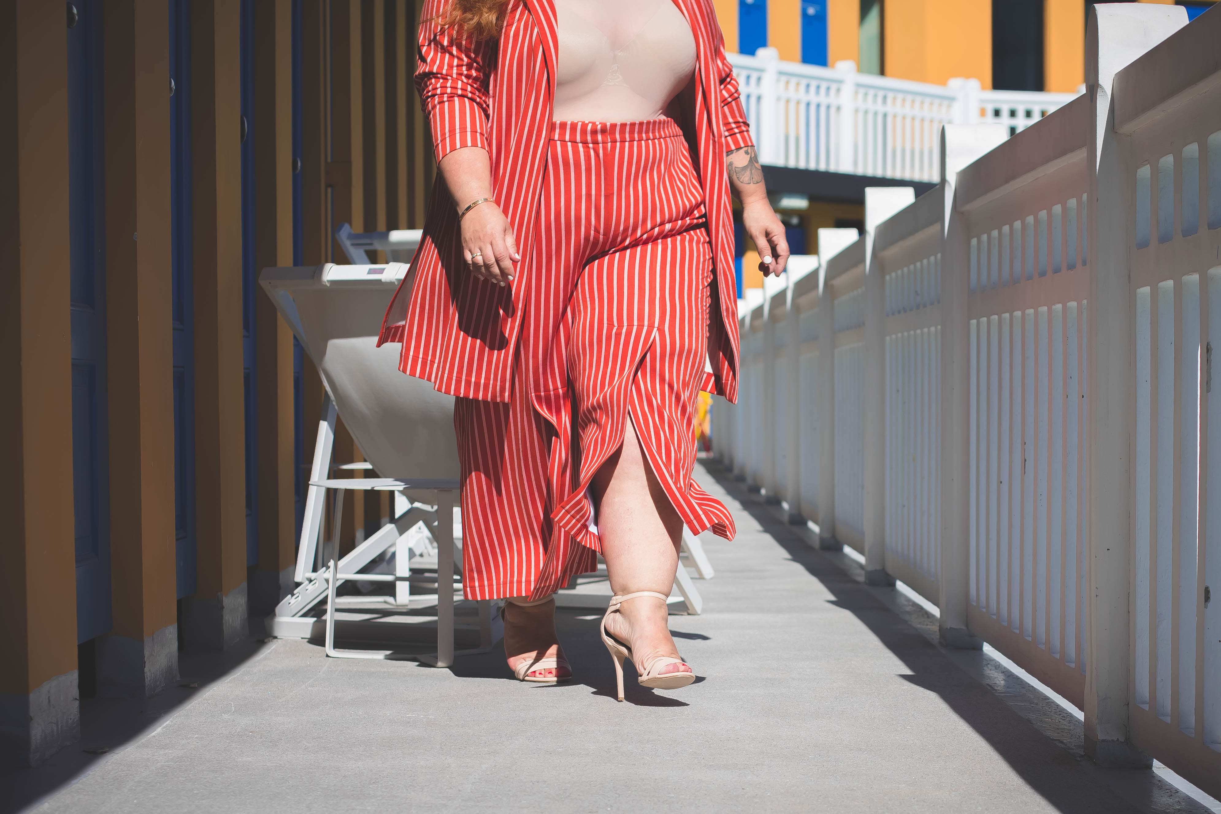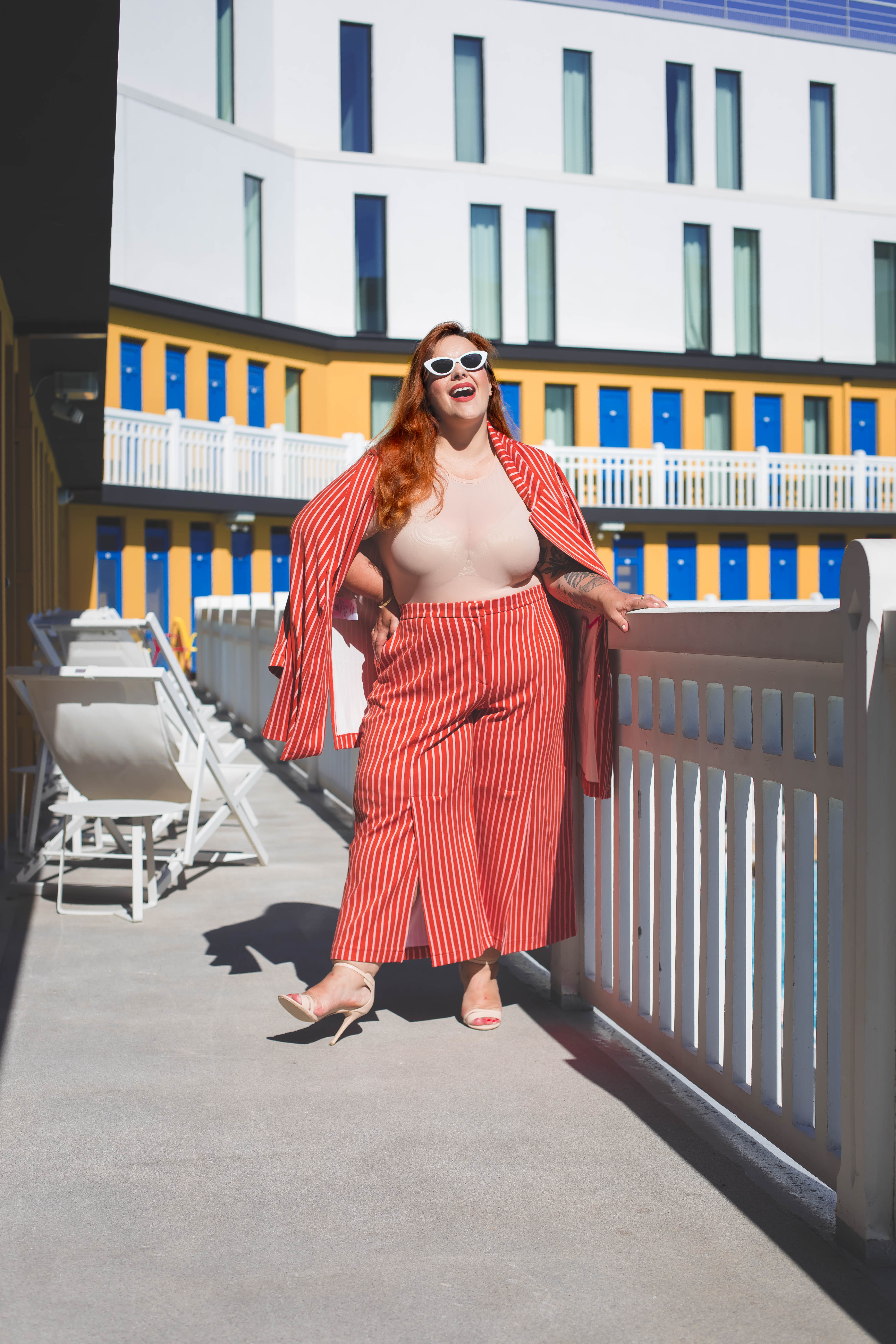Je ne commente pas souvent, mais là oui! J’adore le tailleur rouge rayé et ce contraste avec le body transparent et le soutien gorge du même coloris! So sexy so beautiful!