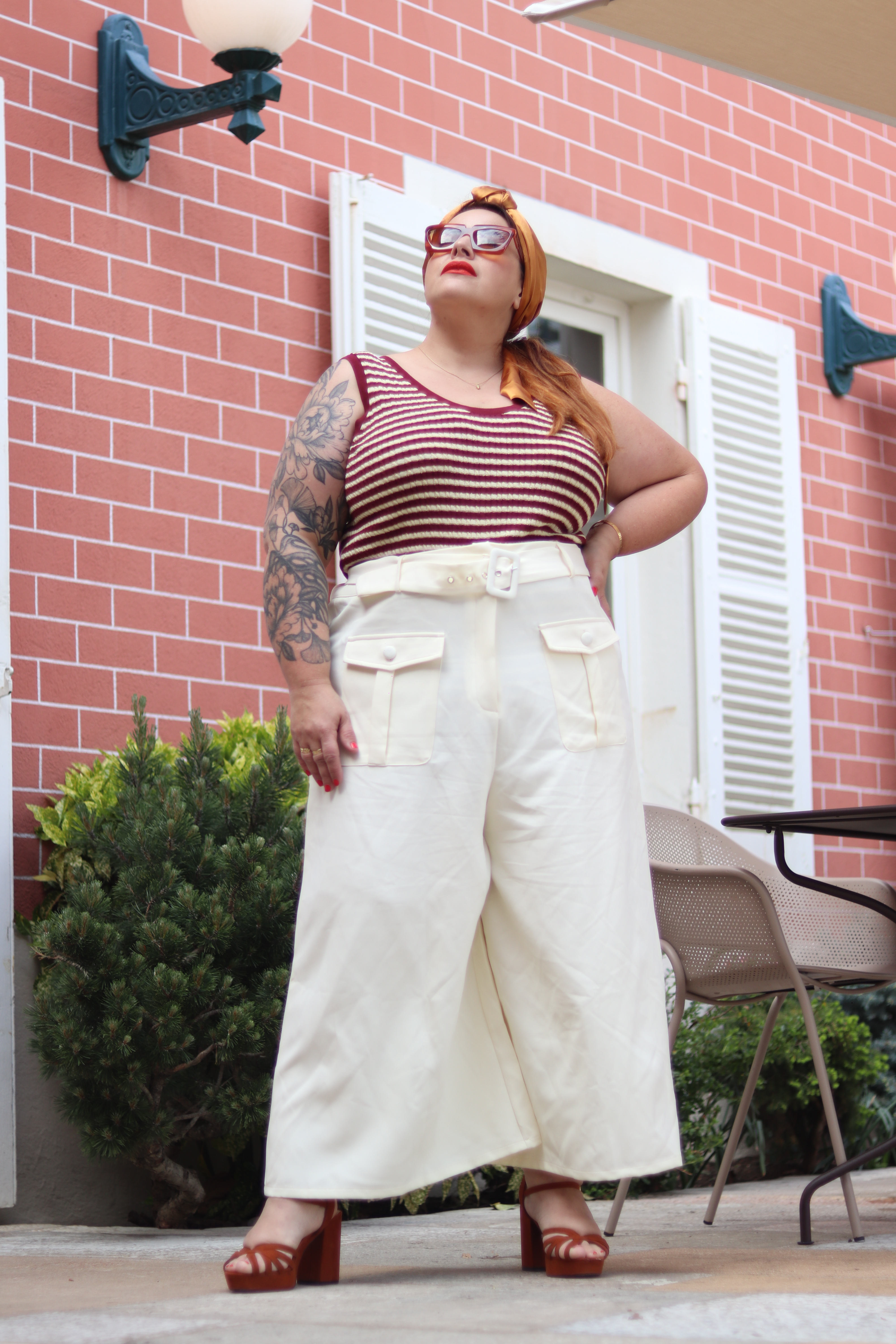 En dessous je porte un pantalon que j’adore, blanc crème et taille haute, j’aime ses poches appliquées. En ce moment je porte beaucoup de pantalons larges avec des hauts ajustés c’est mon grand truc. Et nous allons beaucoup en voir cet automne hiver sur les différentes collections.