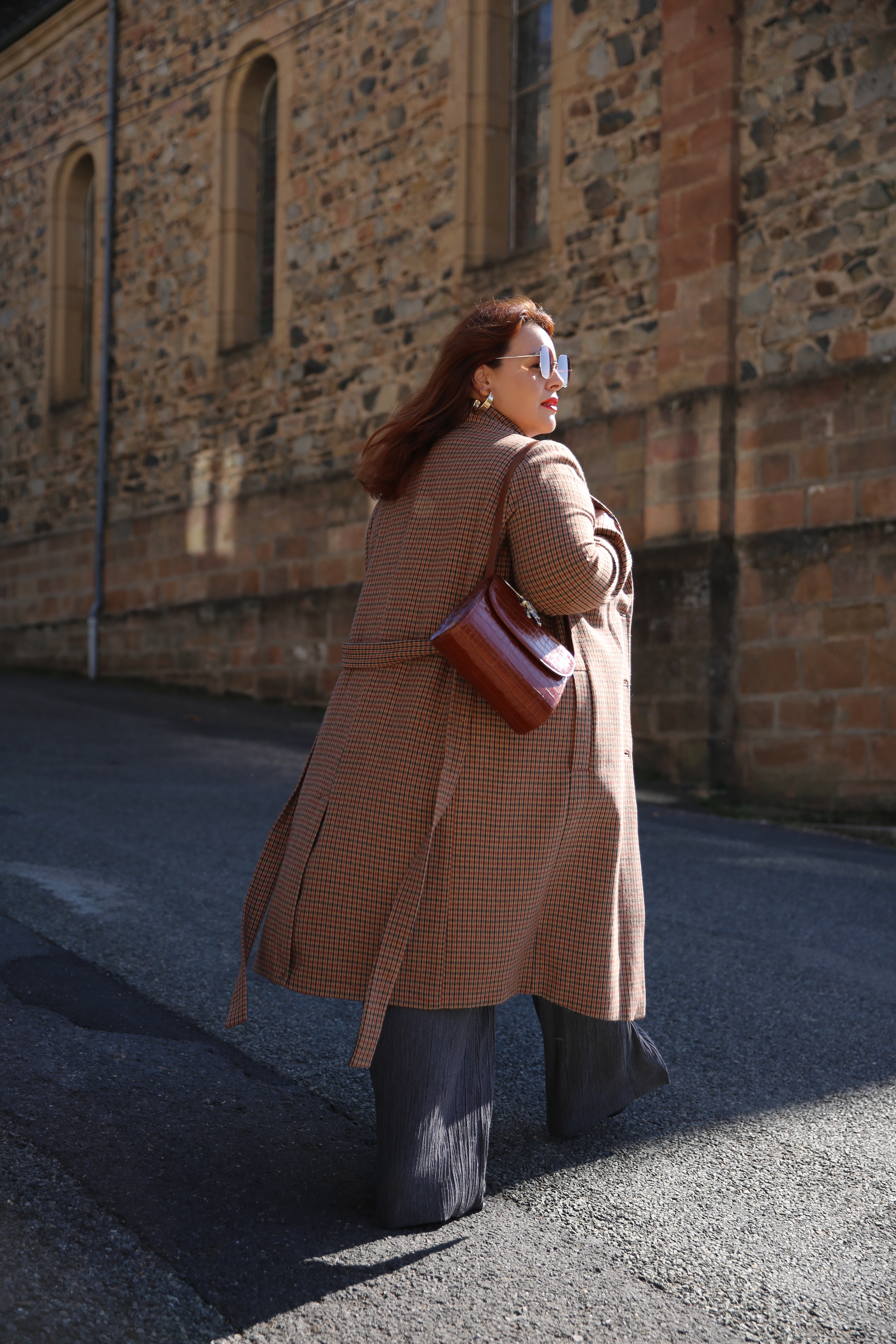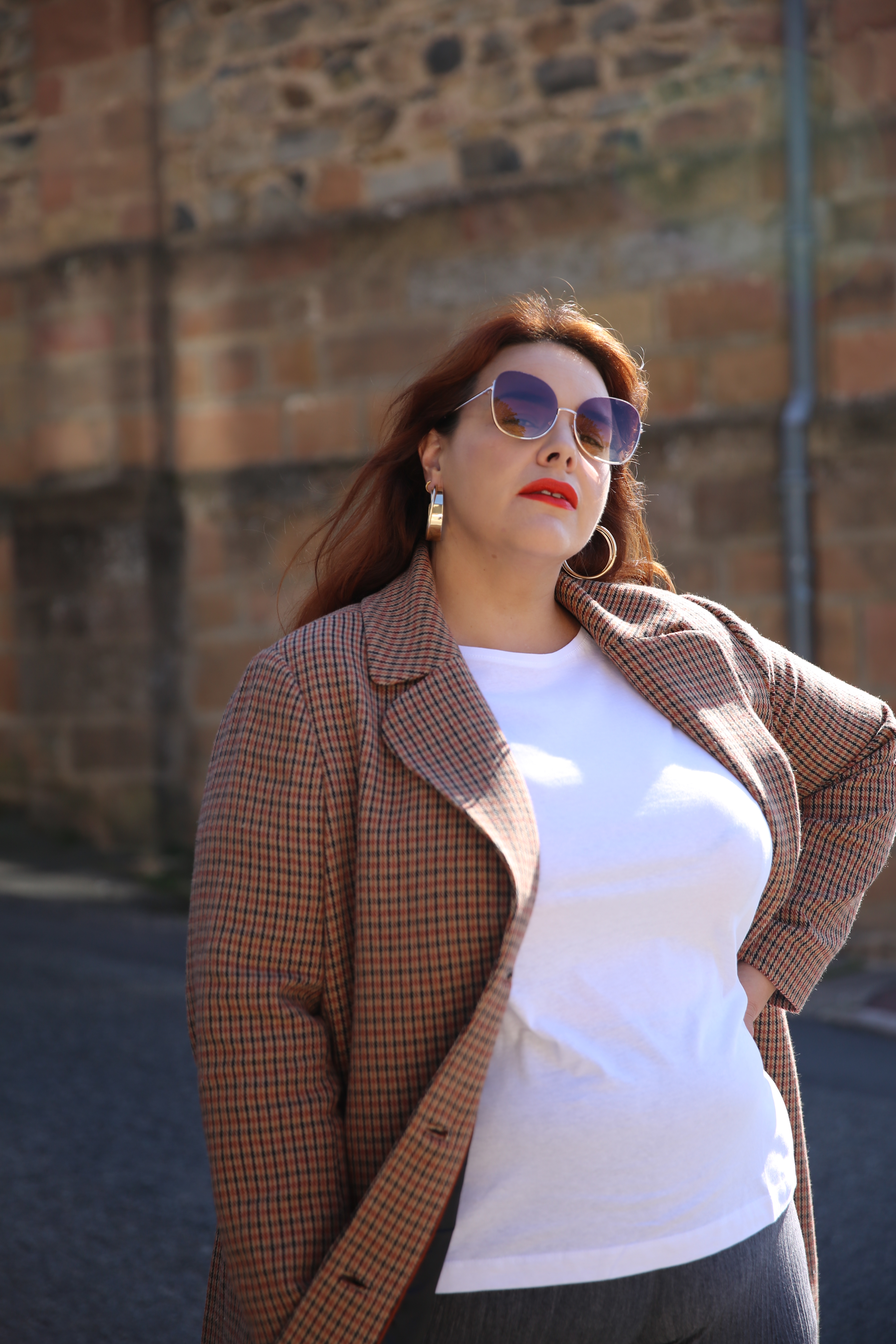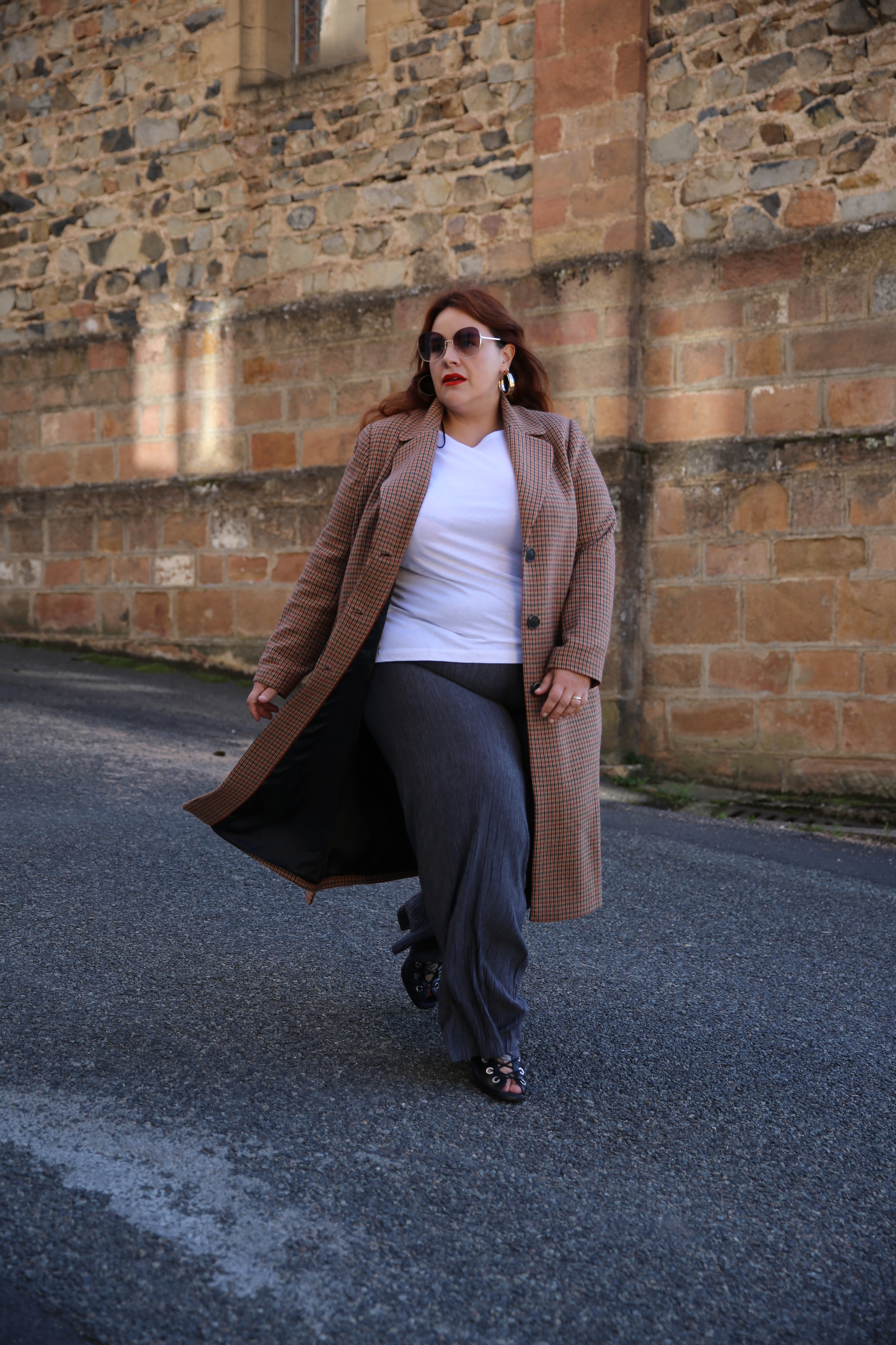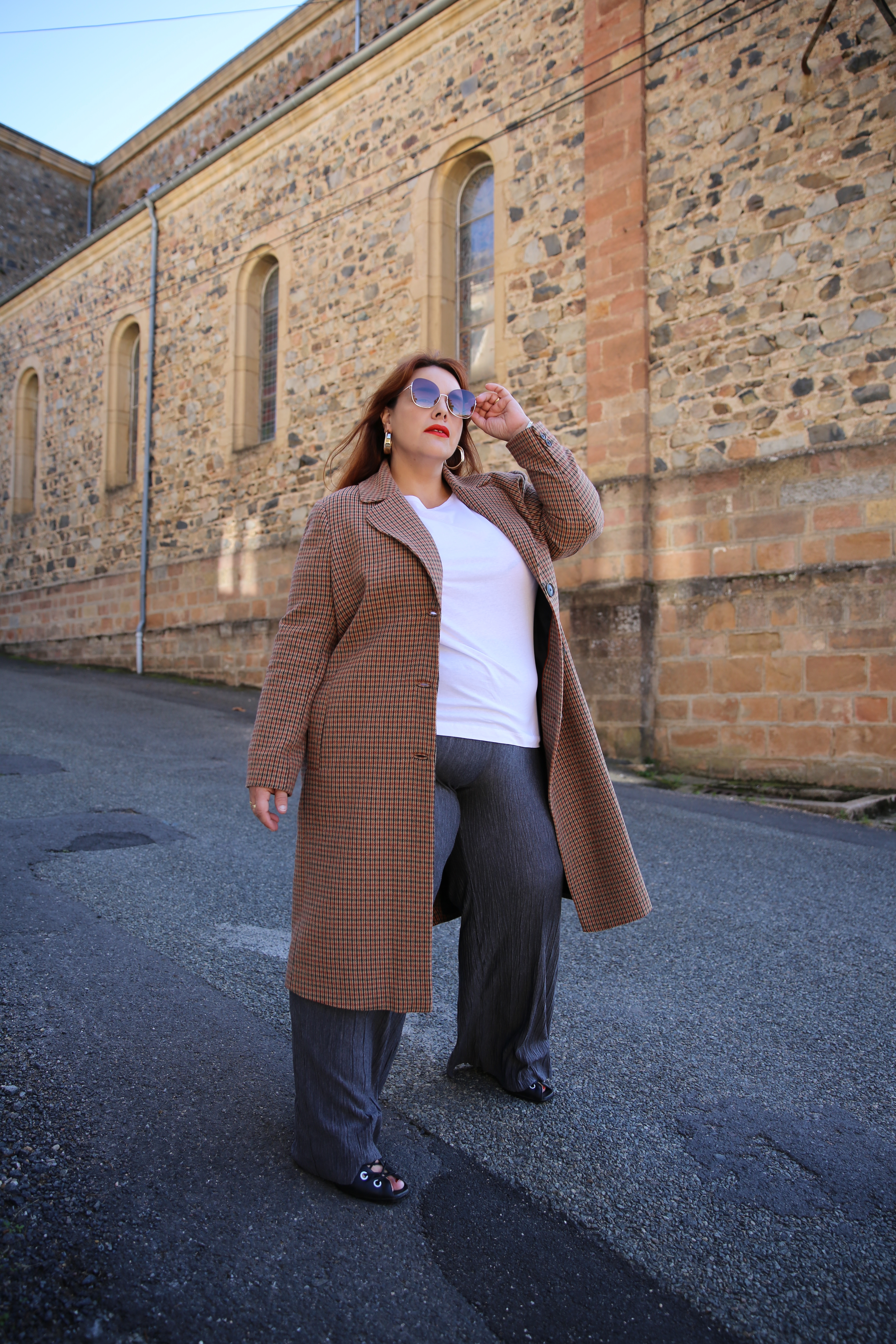 Ce mois-ci j’ai choisi pour débuter un manteau Prince de Galles avec un pantalon large et des lunettes fumées pour un côté vintage des années 70’s que j’affectionne particulièrement.