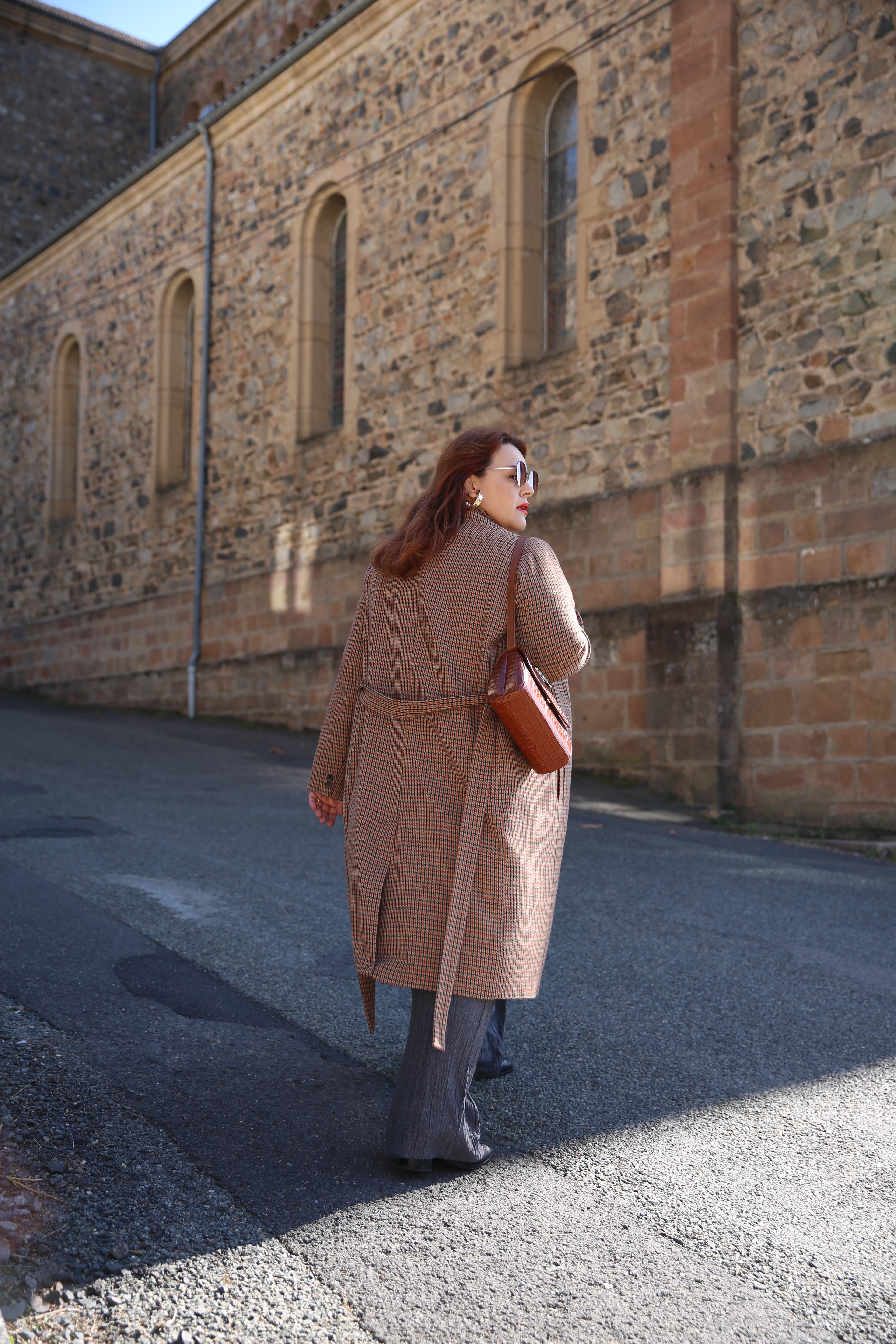 J’ai plusieurs manteaux à carreaux mais je trouve celui-ci particulièrement beau avec ses carreaux et ses tons chauds. Il a une grand cieinture à nouer, sa taille est ajustée contrairement aux autres manteaux plus looses, et sous le col un joli détails en velours rouille.