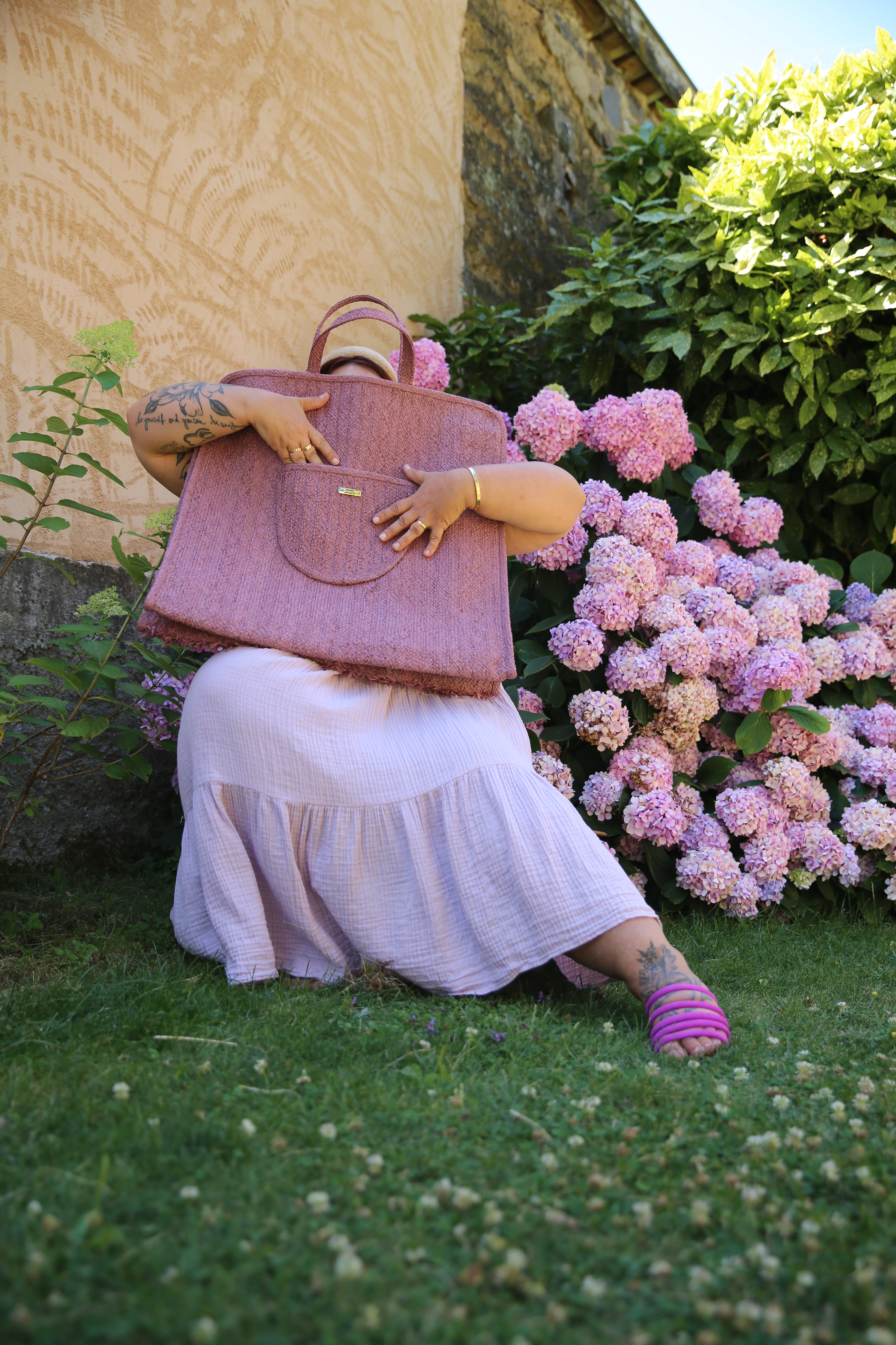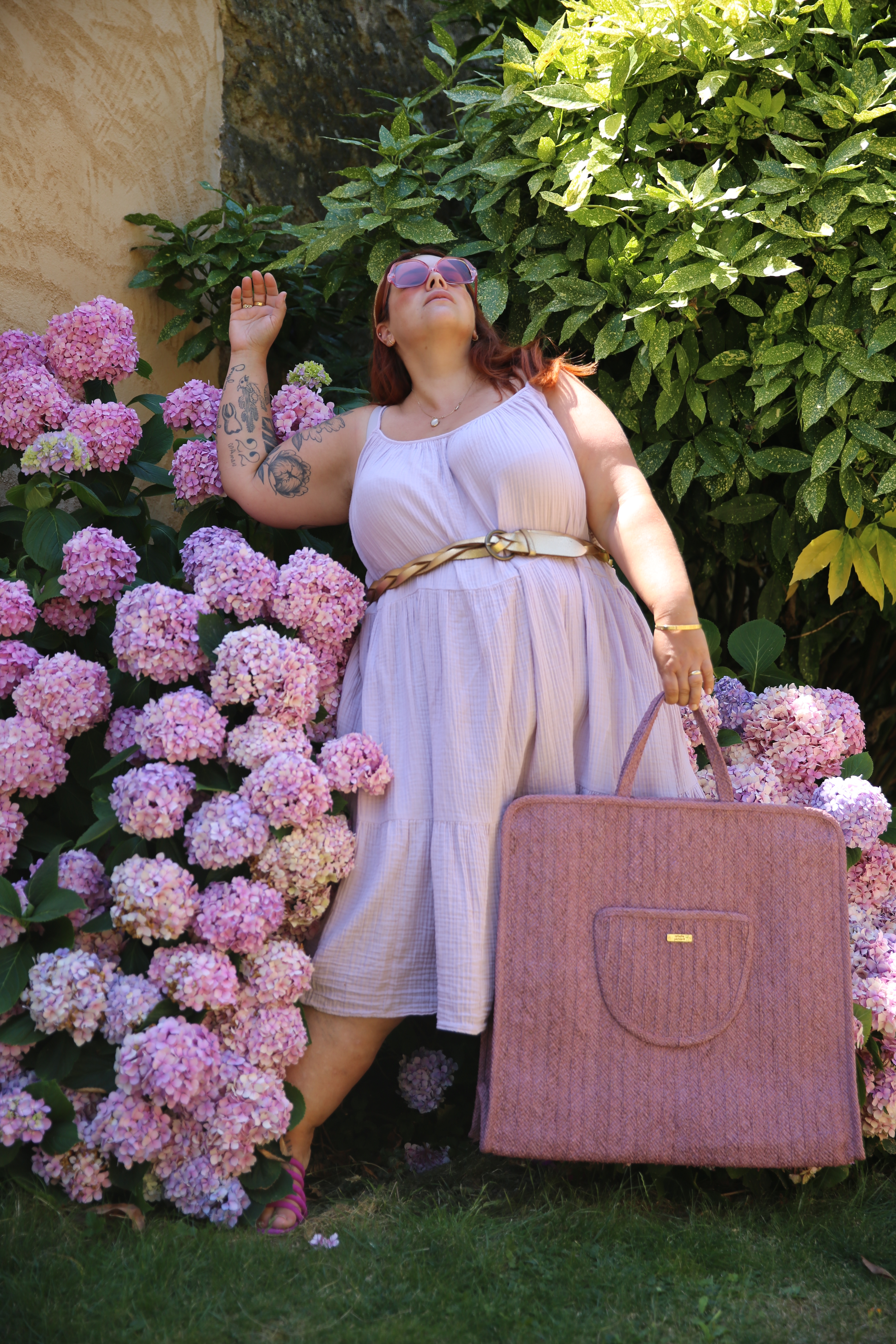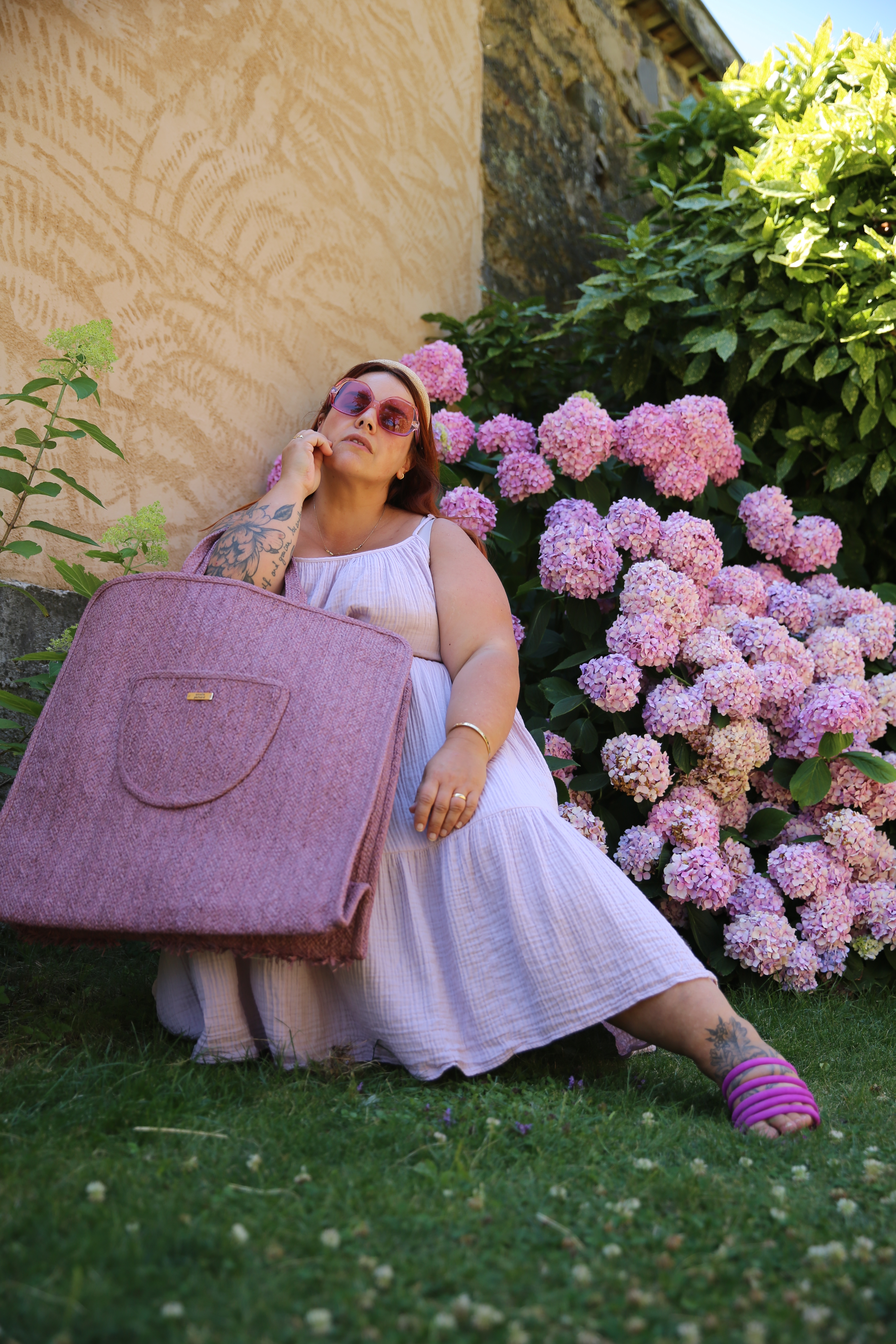 A mon bras, ce sac sur lequel j’ai littéralement flashé, il est si fou!!! Le Fouzitou d’Amélie Pichard (encore) est un sac en raphia tressé complètement démentiel et hors norme. Je suis fan, il est atypique comme moi, nous deux se fut un coup de foudre. Et il faut avouer qu’il marche parfaitement bien avec mon hortensia, ma robe, mes lunettes et mes mules!!