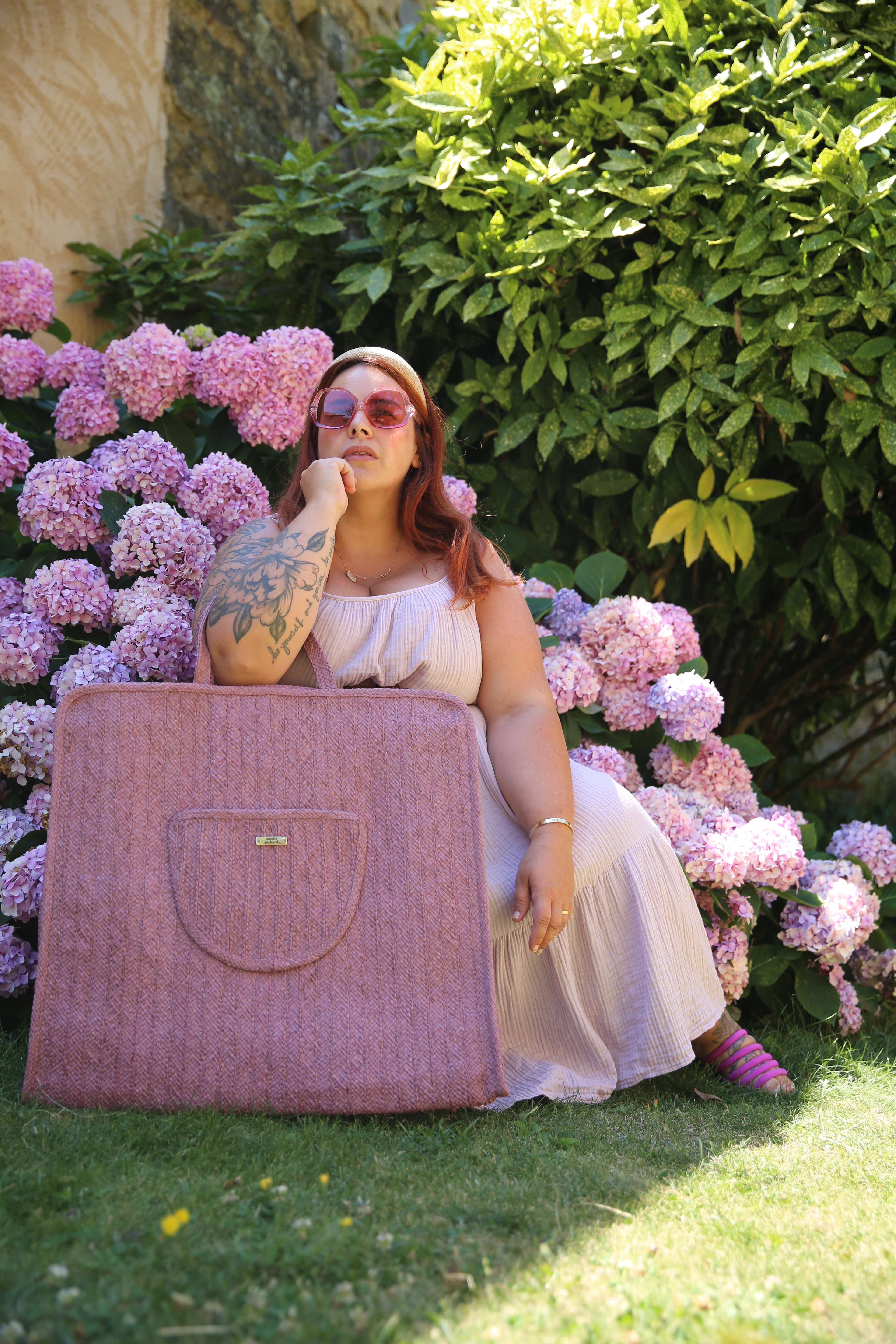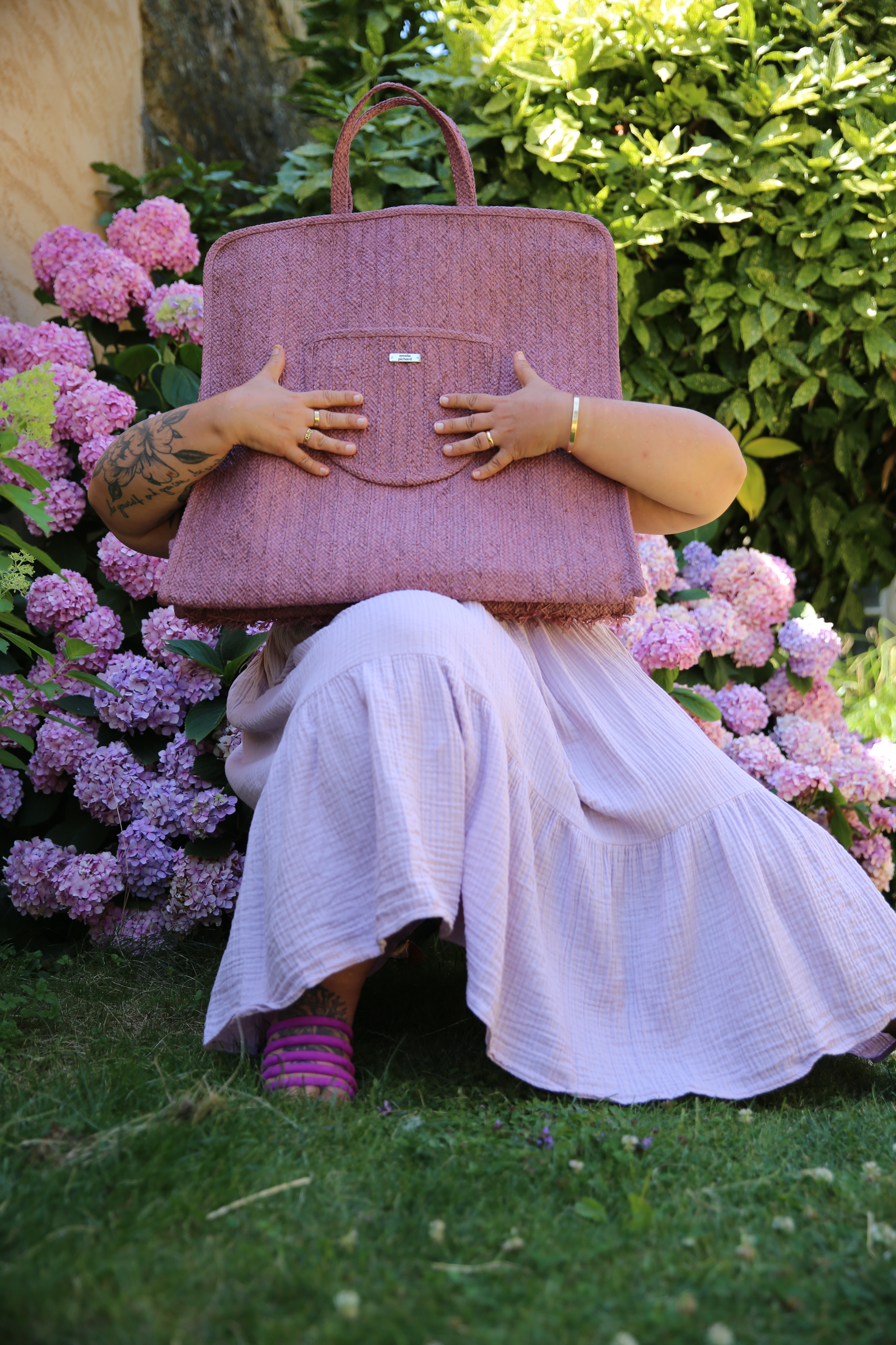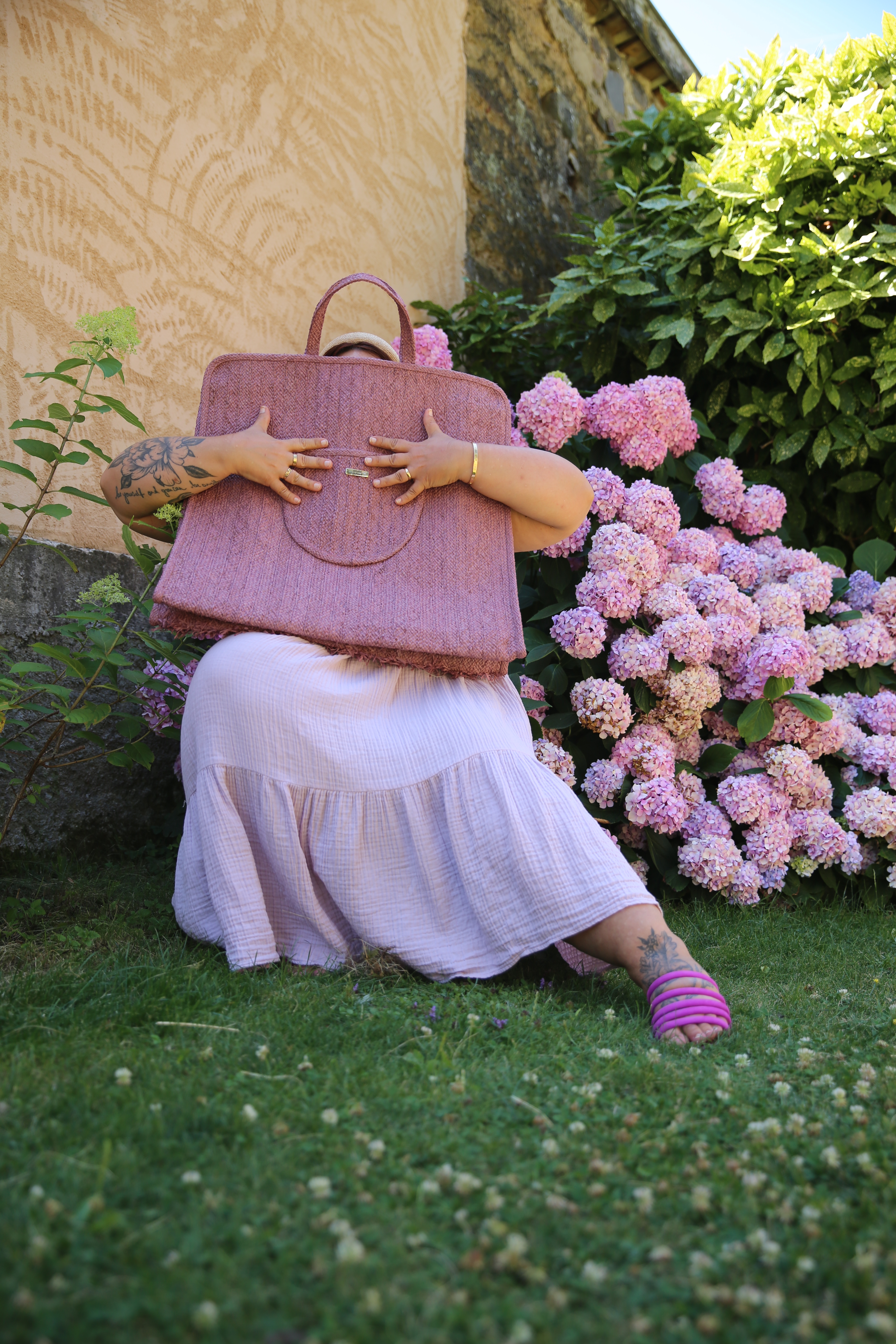 A mon bras, ce sac sur lequel j’ai littéralement flashé, il est si fou!!! Le Fouzitou d’Amélie Pichard (encore) est un sac en raphia tressé complètement démentiel et hors norme. Je suis fan, il est atypique comme moi, nous deux se fut un coup de foudre. Et il faut avouer qu’il marche parfaitement bien avec mon hortensia, ma robe, mes lunettes et mes mules!!
