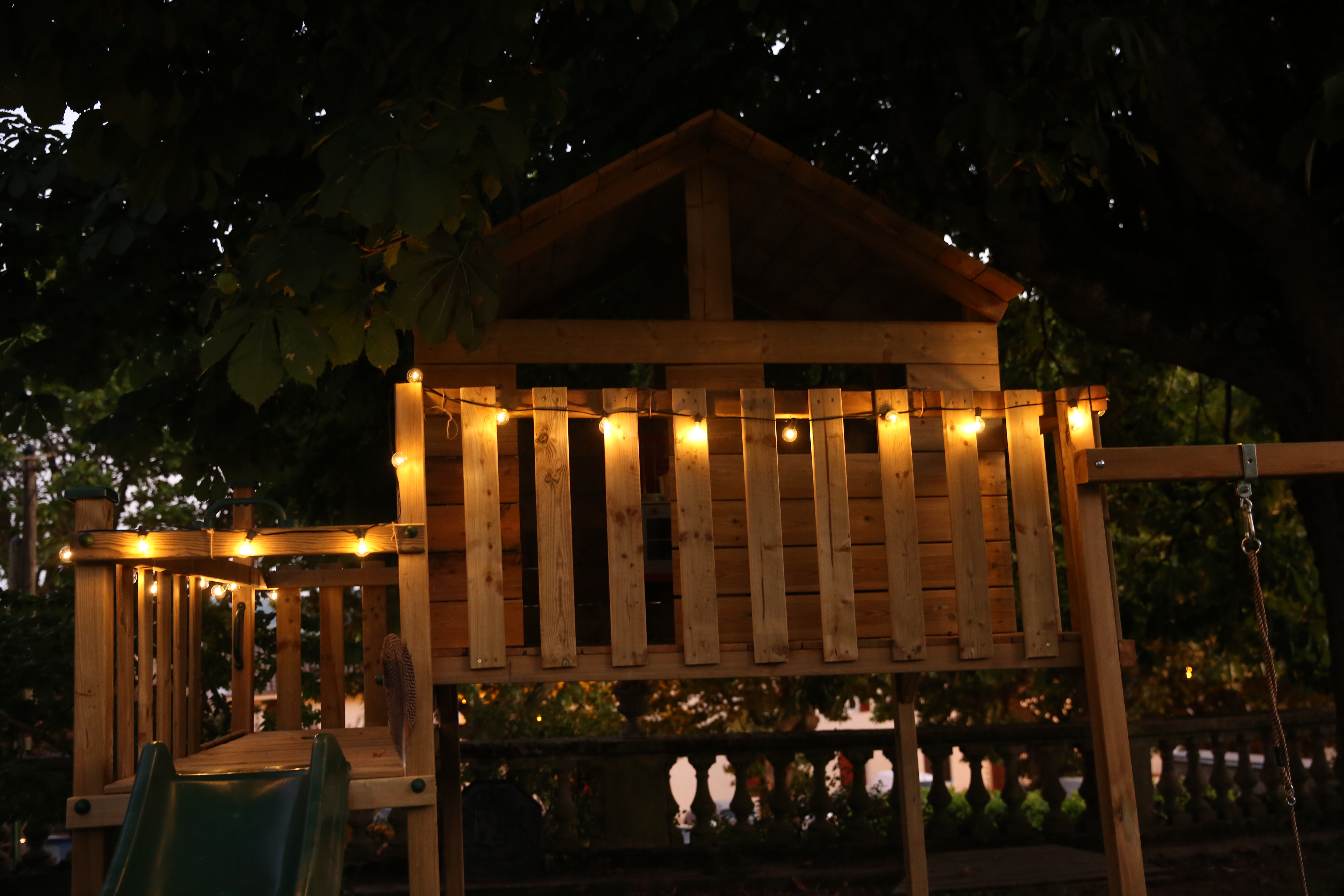Wickey propose tout un tas d’accessoires à ajouter à votre cabane, et surtout toutes les pièces sont remplaçables c’est un détail qui a son importance. Sur notre cabane j’ai choisi de pas fermer le haut avec la bâche fournie, mais je vais compléter avec du bois. J’ai utilisé la bâche pour faire des petits rideaux aux fenêtres. Je pense aussi ajouter une guirlande lumineuse sur la bordure du toit afin de l’éclairer pour les soirées d’été.