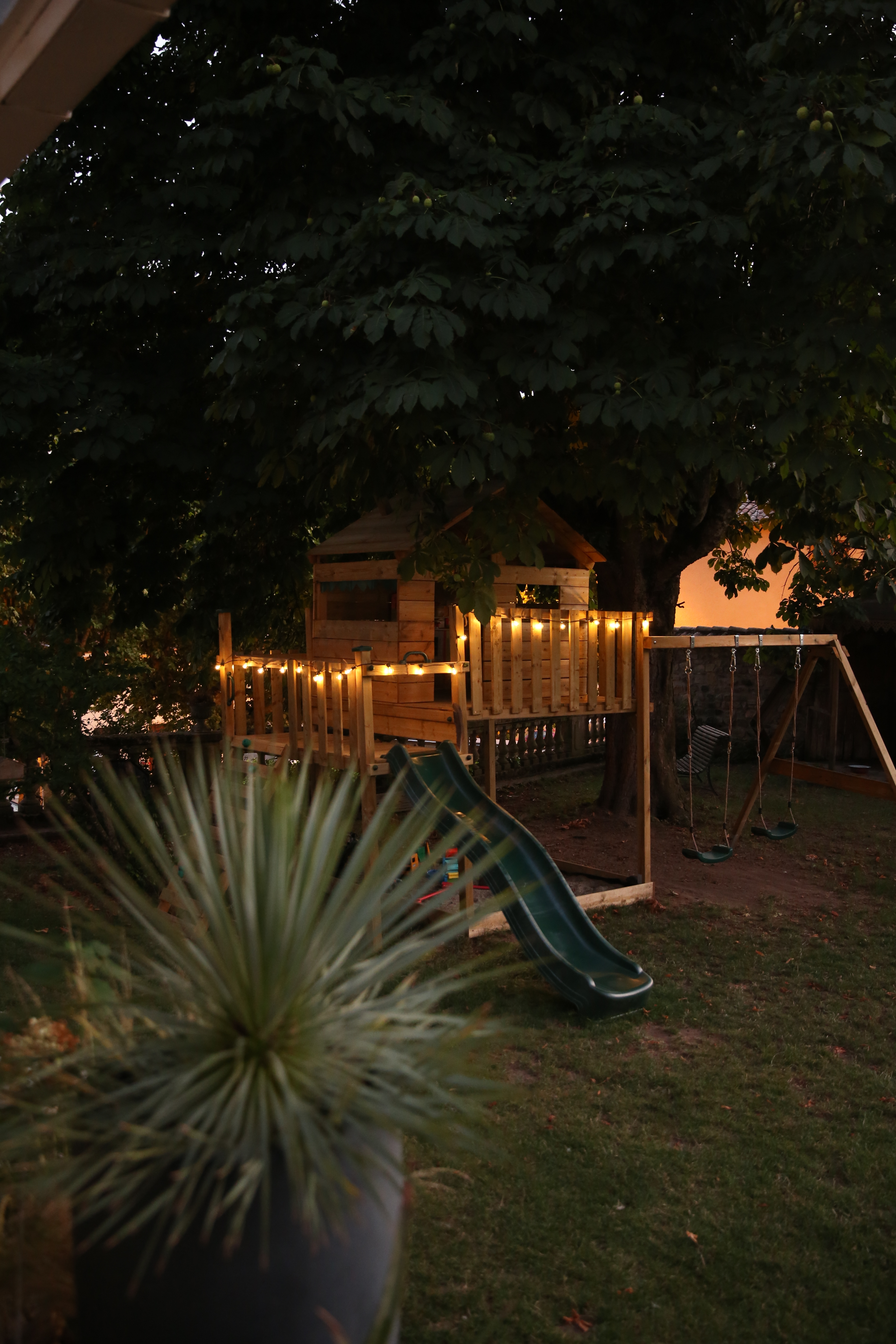 Je partage avec vous quelques photos de l’aire de jeux terminée, le grand marronnier couvre la cabane, ce qui donne encore plus cette impression d’avoir une cabane dans les arbres.