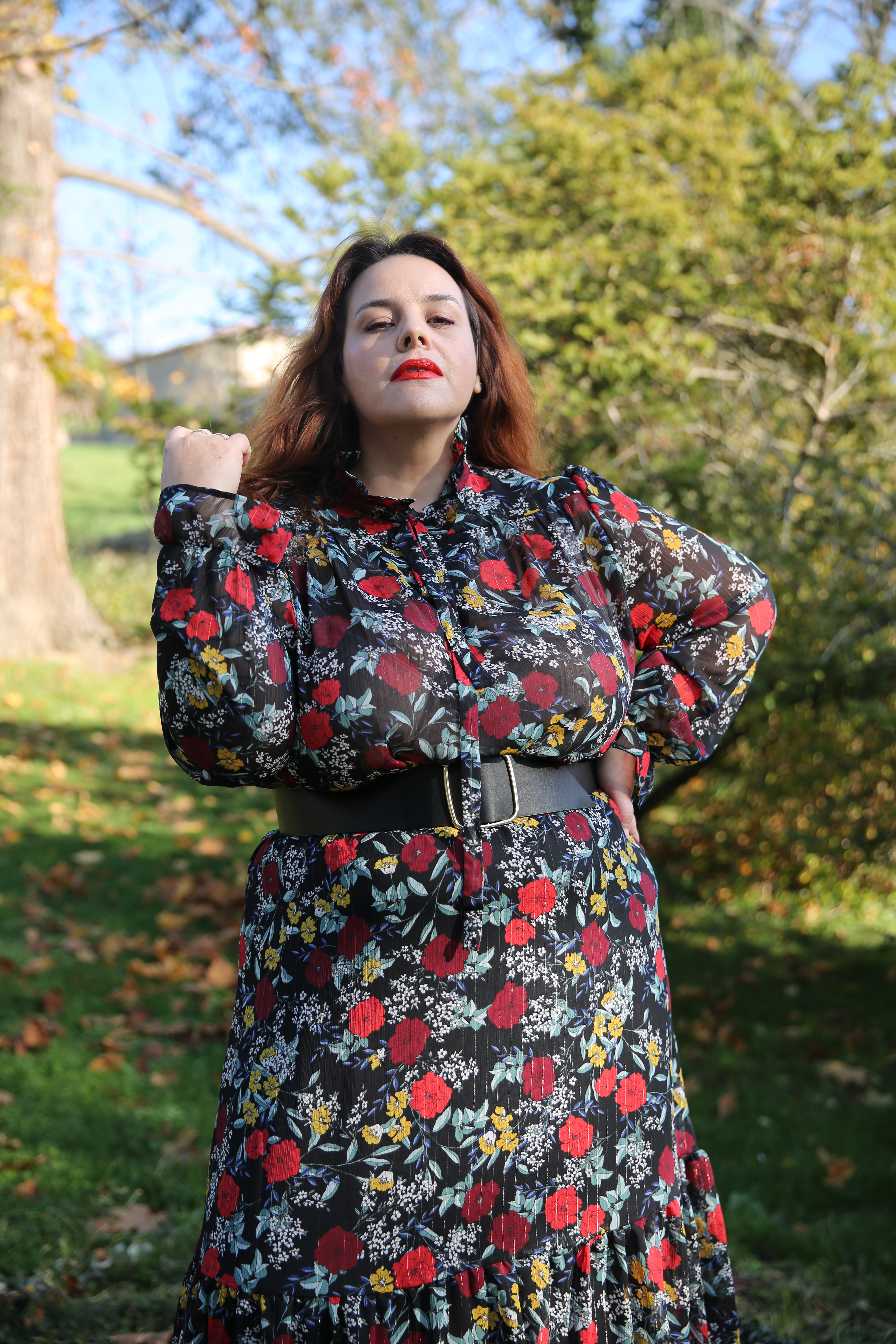 J’ai choisi ce chemisier et cette longue jupe dans le même imprimé pour donner l’effet du robe. Il existe la version robe manches courtes mais j’aimais bien l’effet du col lavallière sur le chemisier. Et toutes les pièces sont disponibles jusqu’au 56 et dans les deux versions, petite et grande taille, je vous ai mis les liens juste en-dessous.