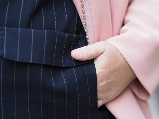 Below I wear a navy pinstripe dress tennis history not to have a too strong color block.