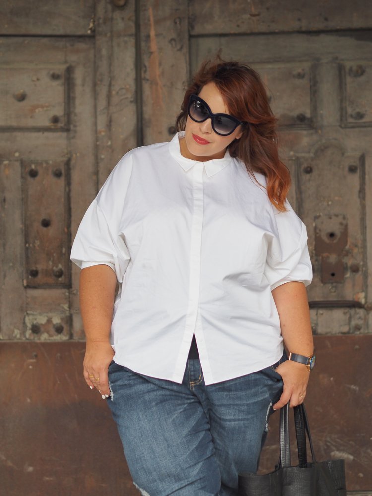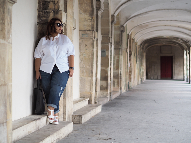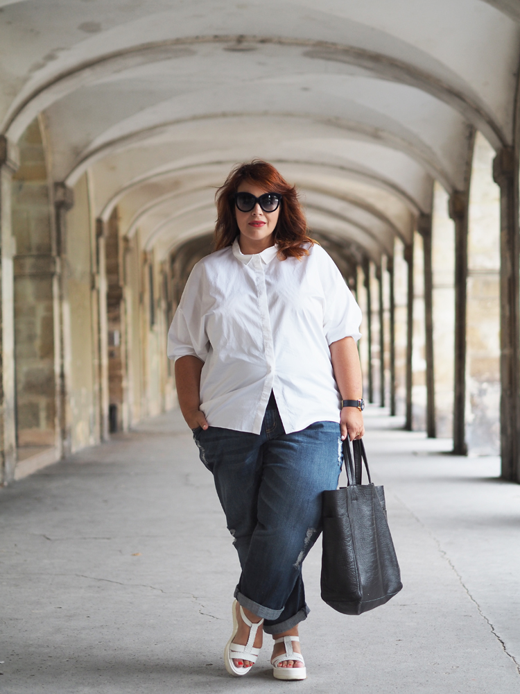 Une chemise bien blanche et un jean c’est toujours chic sous les arcades de la place des Vosges! Tu m’as convertie à Cos (http://www.niftyfifty-and-the-city.com/soldes-andre-et-cos/). En quelle taille la chemise? parce que le 44 qui semble être leur taille maxi ne semblait pas tailler très grand et il me faut un peu plus, poitrine oblige….
