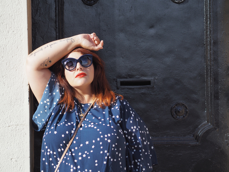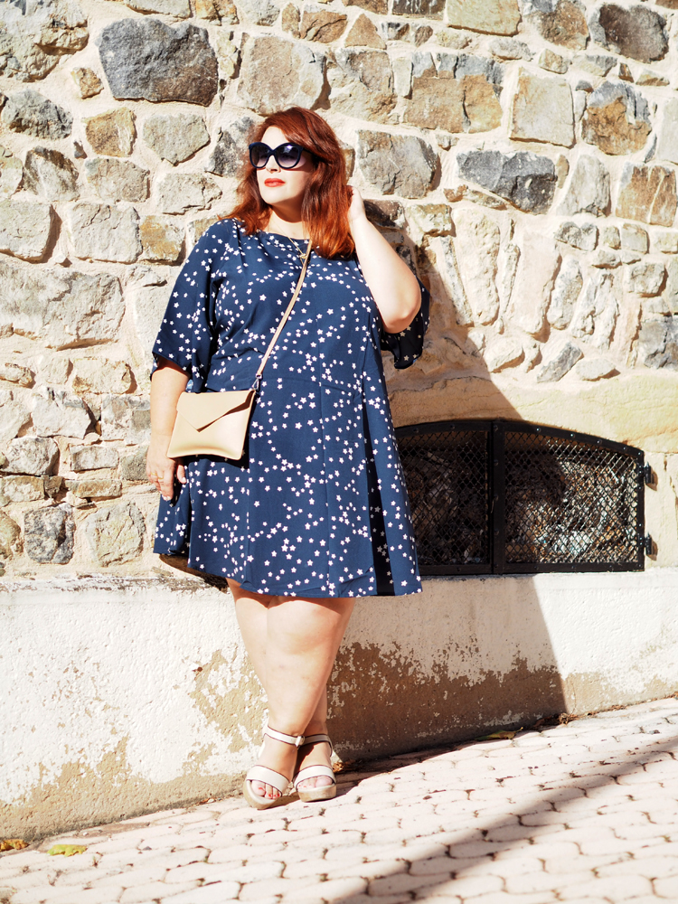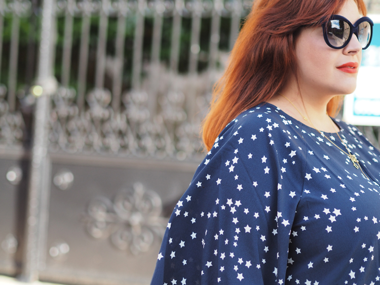 La robe étoilée est superbe et se marie très bien avec tes cheveux et lèvres flamboyants :)