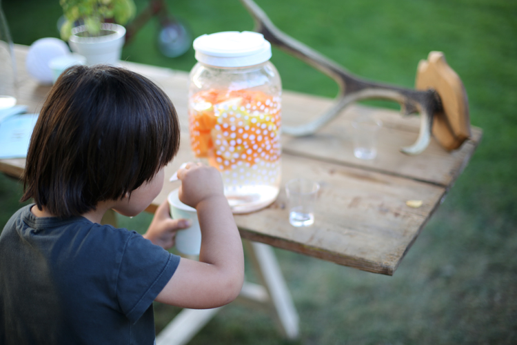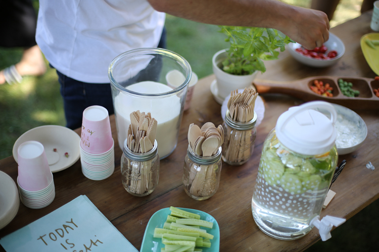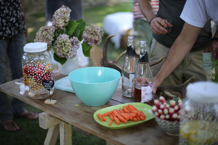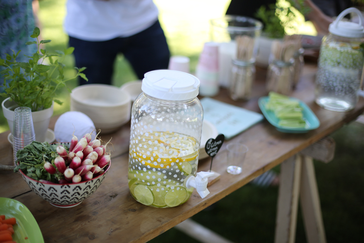 Avec cette chaleur, nous allions boire beaucoup d’eau et j’avais prévu mon coup. Des bouteilles d’eau sur un buffet ne sont pas du plus grand effet, alors j’ai préféré faire 5 fontaines à eau fruitée. Et elles ont eut énormément de succés, les petits et les grands se sont régalés. En plus elles sont simples à réaliser. Il y avait: pomme cannelle – citron citron vert – concombre menthe citron – fraise orange menthe – melon citron. Il me suffisait de les remplir d’eau et de glaçons régulièrement.