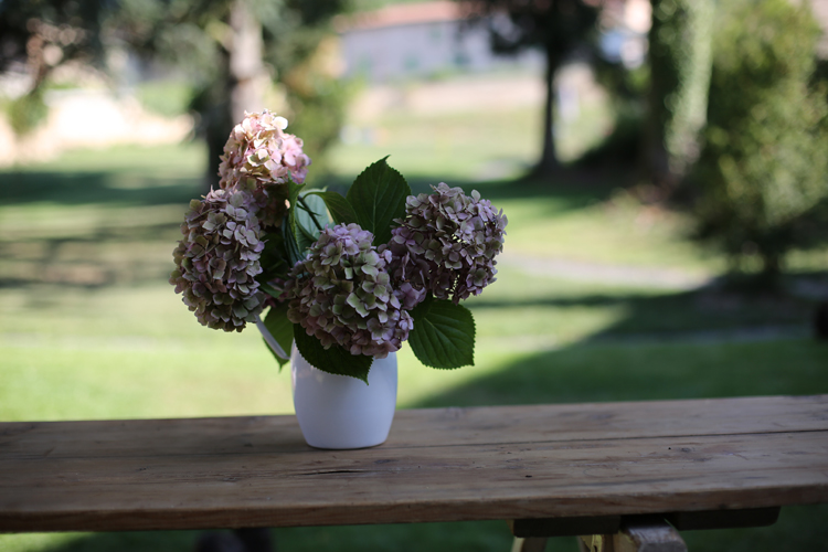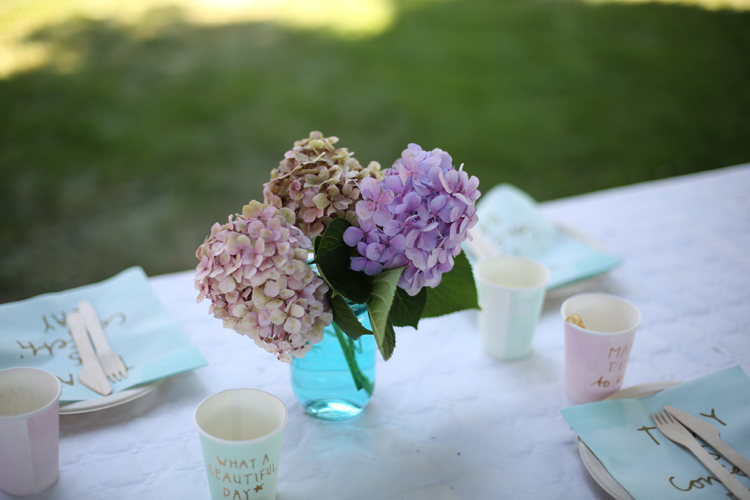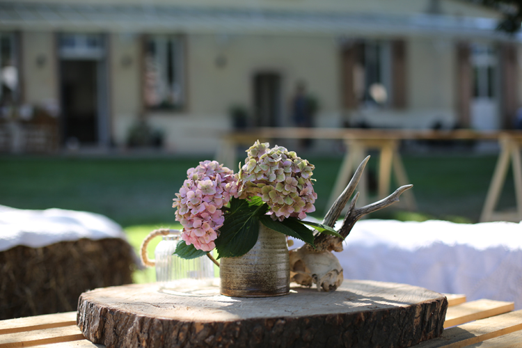Quelques bouquets d’hortensias sur les tables, des couverts en bois et des assiettes en bambou recyclé, et des serviettes en papier pour faciliter l’organisation.