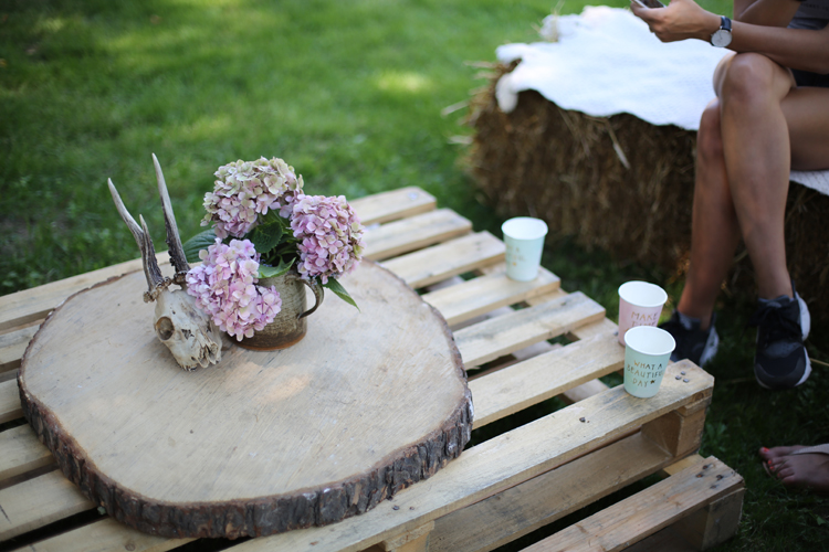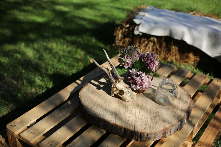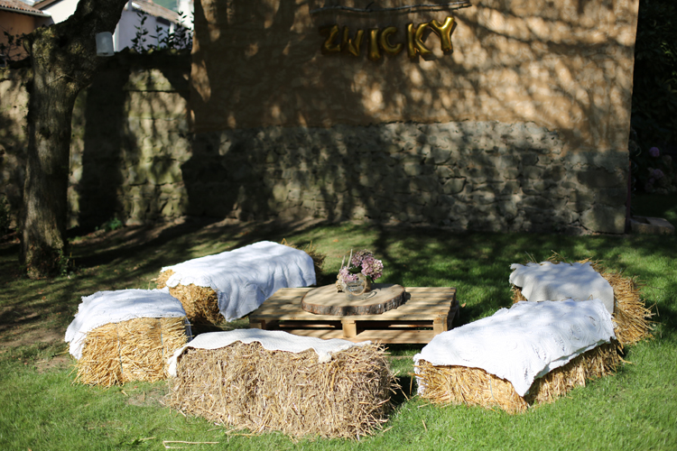 Oh que c’est joli – une fête qui respire la simplicité et la joie de partager le bonheur d’être avec ceux qu’on aime. J’adore ce coin détente créé avec quelques bottes de pailles – sont-elles destinées à tes poules une fois la fête finie ?