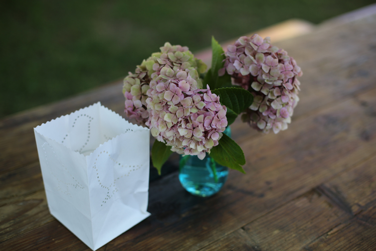 Sur les tables, des petites lanternes en papier dans lesquelles j’ai glissé des lumignons en verre afin d’éviter les départs de feu non désirés.