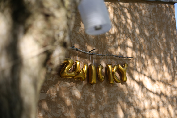 Sur un des murs, j’avais prévu un photo call, histoire de délirer un peu. Pour cela j’ai choisi des ballons alu que l’on peut gonfler soi-même, pas besoin d’hélium. Une branche de bouleau et je tenais la bannière de ma #ZwickyHappinessHouse Party.
