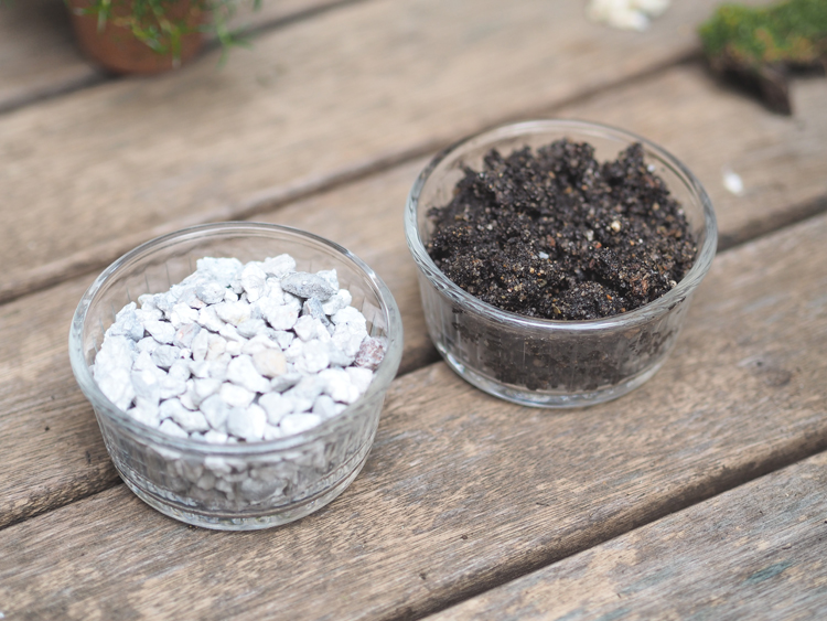 Puis vous ajouter le terreau pour cactus. Mon astuce, mouillez votre terreau (humidifier pas détremper) avant de le mettre dans le bocal. Vous éviterez ainsi l’arrosage du début et de souiller votre déco dès le début. Cela permet aussi d’avoir dès le début la bonne dose d’eau pour vos futures plantes. 4cm de terreau ou l’équivalent de la hauteur de la motte de vos plantes.