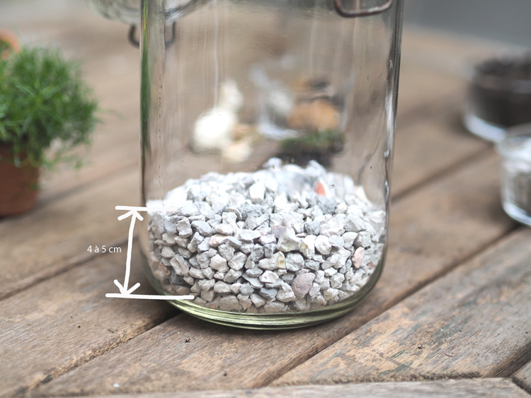 Le premier bocal que j’avais réalisé, j’ai fait l’erreur de ne pas penser au drainage de l’eau, j’avais directement placé la terre puis planter mes végétaux, mais après quelques semaines les plantes ont pourri.
