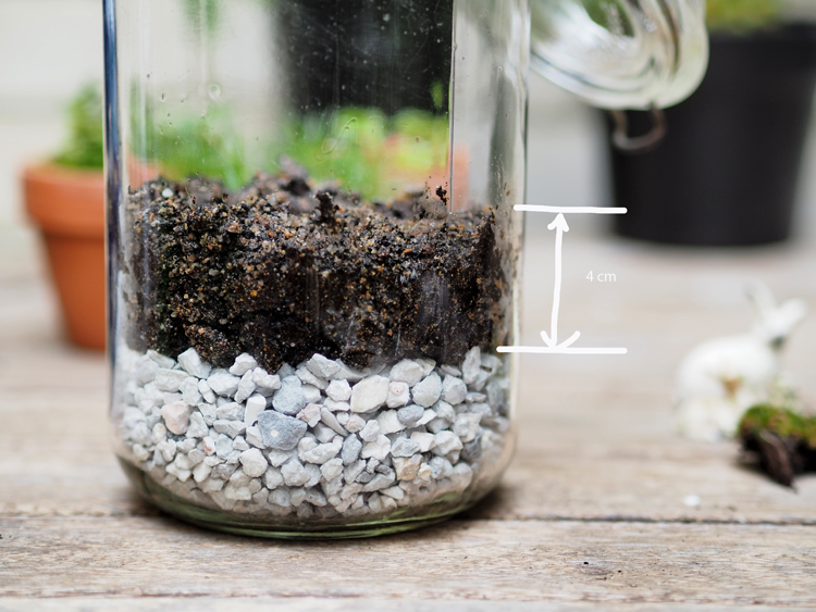 On commence par placer une bonne couche de gravier sur le fond, qui va permettre à la terre de bien se drainer et l’eau ne va ainsi pas stagner dans la terre. Si vous n’avez pas de gravier à disposition, perso j’achète le mien chez Truffaut, du gravier pour les aquarium. En plus il y a du choix au niveau des couleurs pour les assortir à votre intérieur. Il faut mettre environ 4 à 5 cm de gravier.