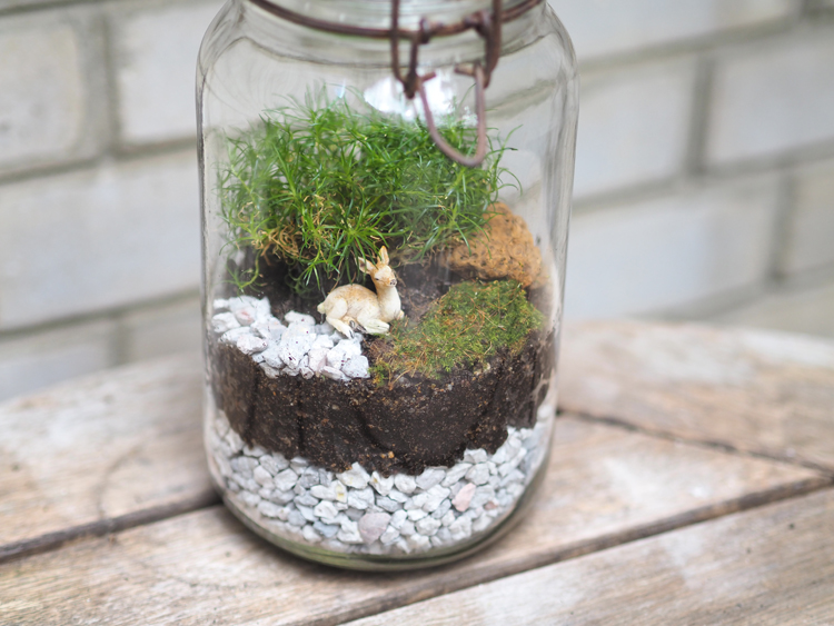 Il ne vous reste plus qu’à garnir votre petit jardin avec de la mousse, un peu de gravier si vous le désirez et une pierre pour créer du relief à l’ensemble.