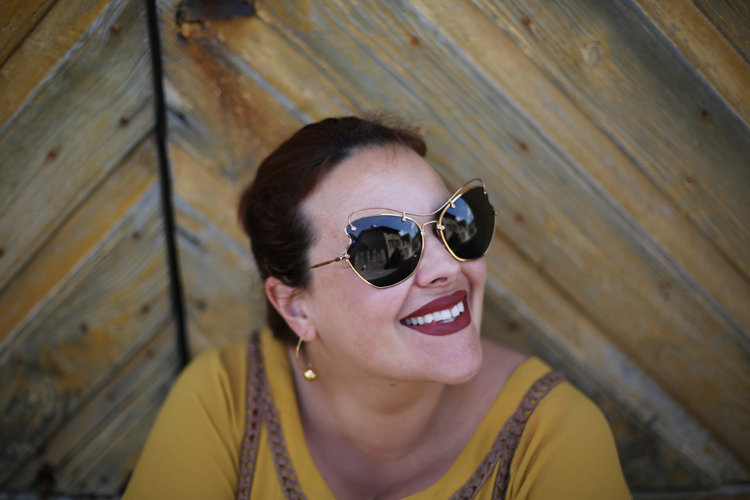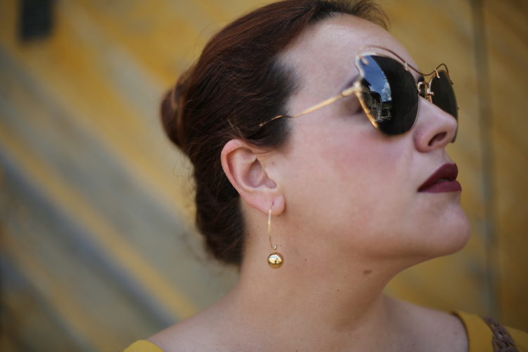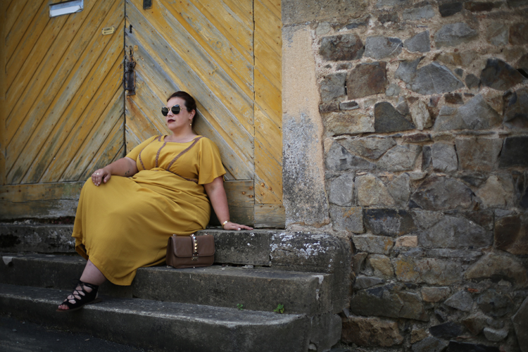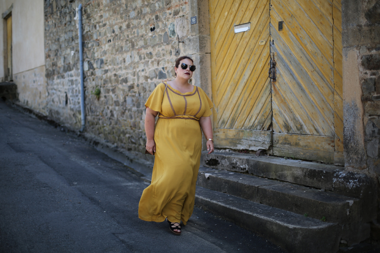 Waou! j’adore la couleur jaune moutarde. Elle te va bien et je crois qu’elle m’ira aussi car on a la même couleur de teint. C’est une très jolie robe d’été. Et la lunette! elle est originale :)