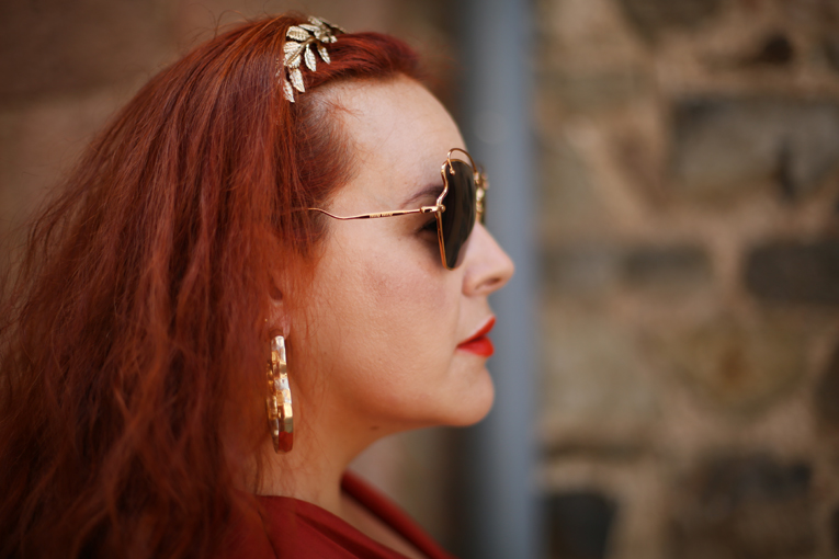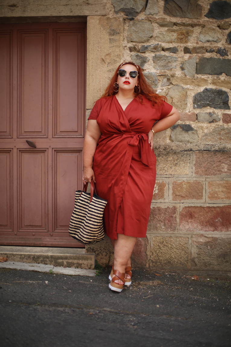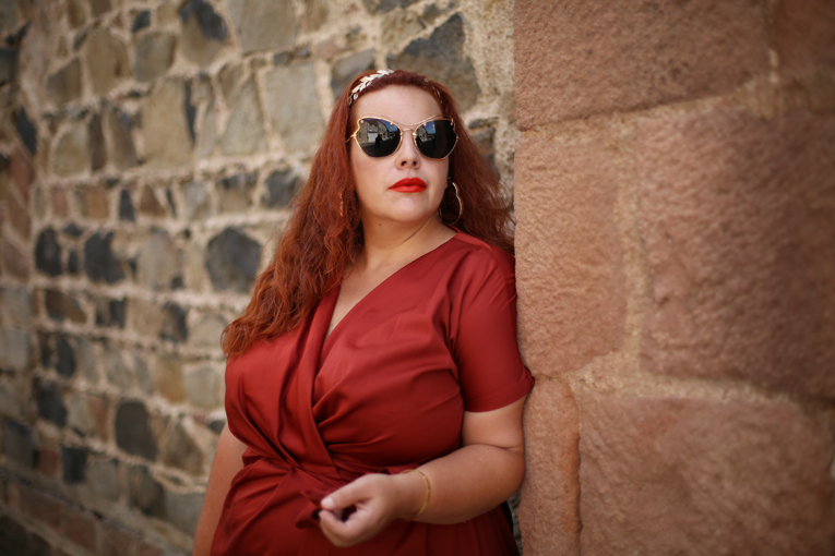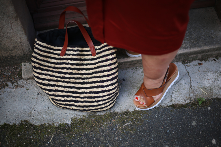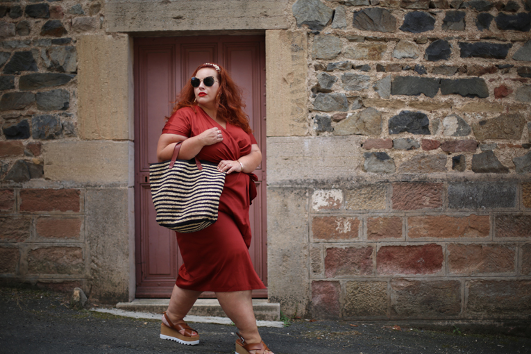 Robe Marina Rinaldi – Serre-tête Asos (similaire ici) – B.O Pimkie – Sandales Jonak – Lunettes Miu Miu – Panier Sézane