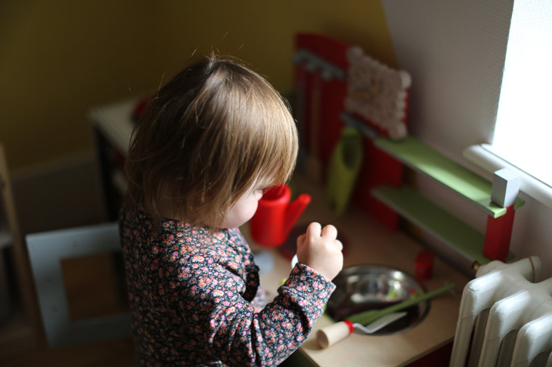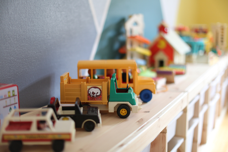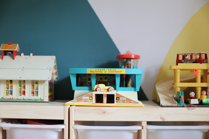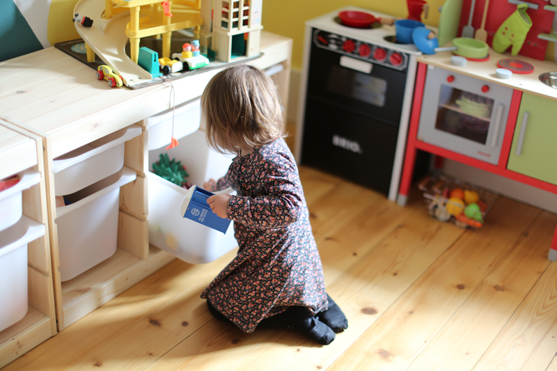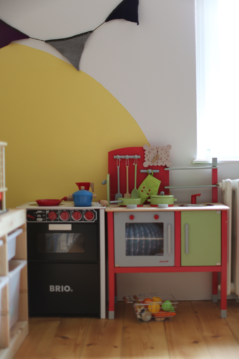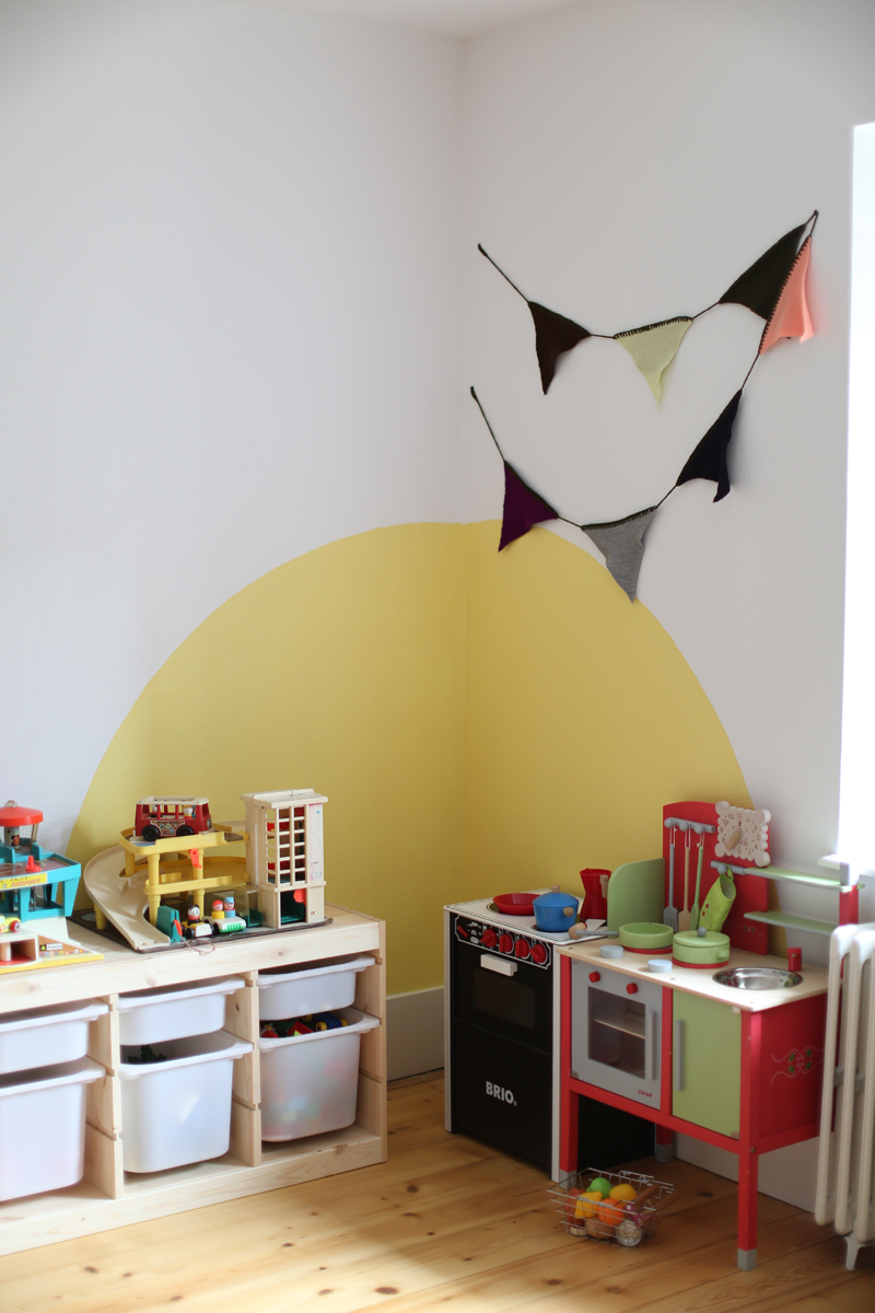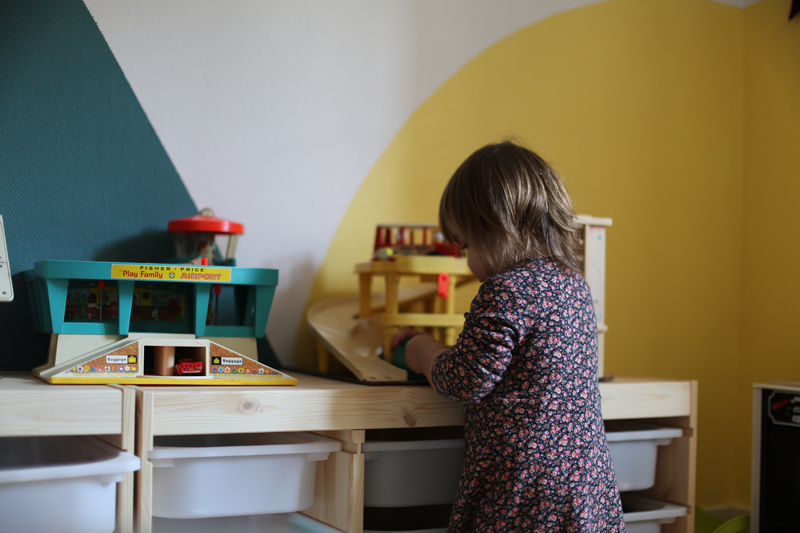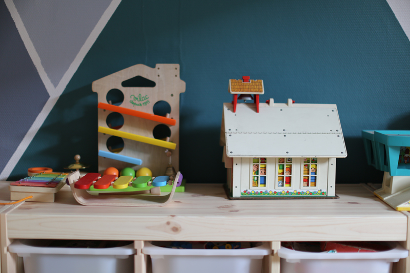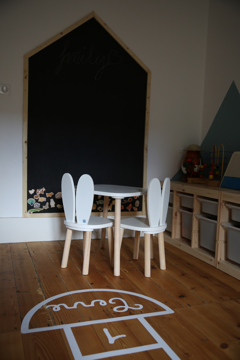 Il m’a fallu quelques jours de travaux peinture et assemblage des meubles, création du tableau noir mais à présent cette pièce est un des endroits favoris de mes enfants. C’est également un terrain neutre, je trouve qu’ils se chamaillent moins pour les jouets, puisque tout ce qui se trouve dans cette pièce appartient aux deux enfants.